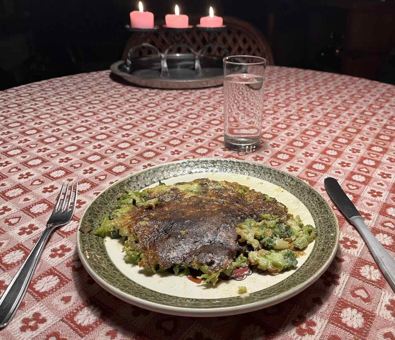 Hauptgericht Broccoli-Frühlingszwiebel-Omelett, Nachspeise Banane natur.