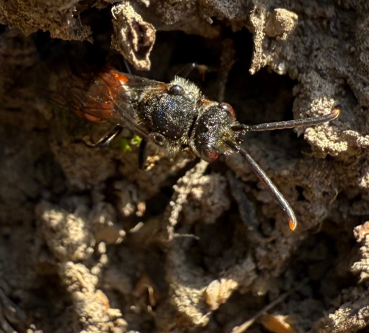 Rotschwarze Wespen Biene. Eine parasitär Lebende Wildbiene. Sie scheint hier die Nisttunnel von Andrena Bicolor zu untersuchen