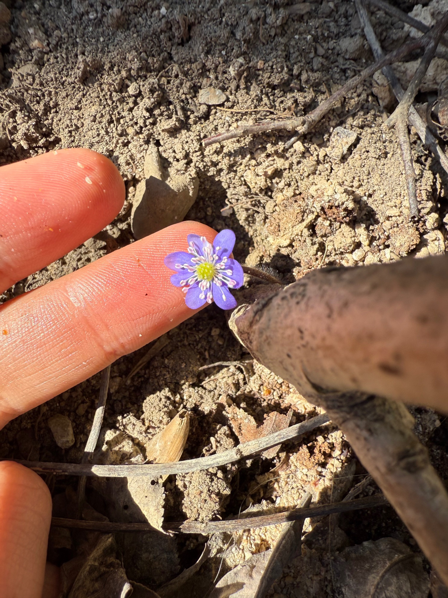 Diese hepatica Blüte ist extrem winzig: kleiner als meine Fingerspitze: