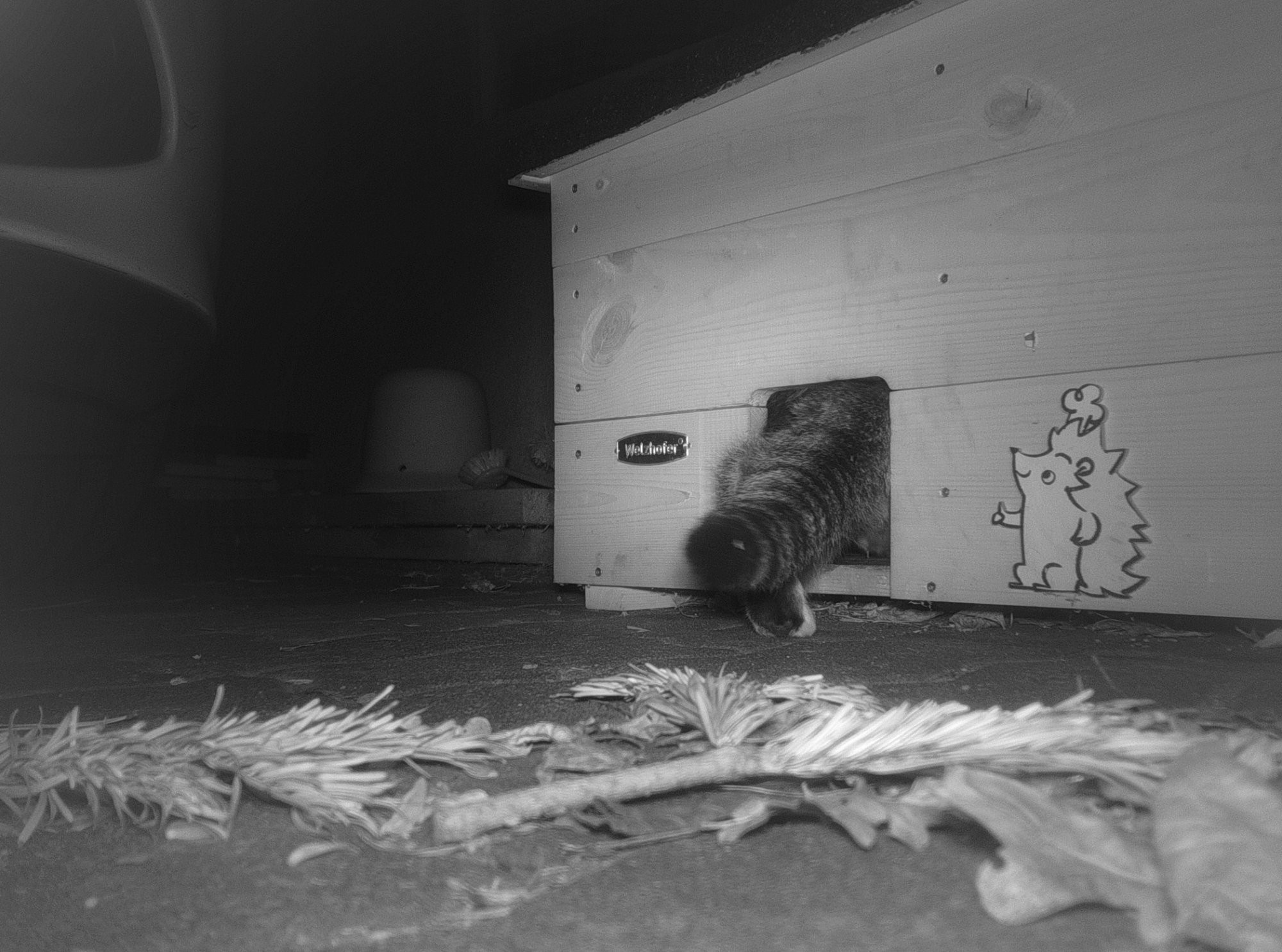 Ein Igelhaus soll ja eigentlich für Igel sein. Es ist angeblich so konstruiert, dass andere, größere Tiere nicht ans Futter gelangen. Dafür gibt es versetzt hinterm Eingang eine Klappe, dann geht es noch einmal um die Ecke in die zweite hintere Kammer. So weit so gut - in der Theorie.