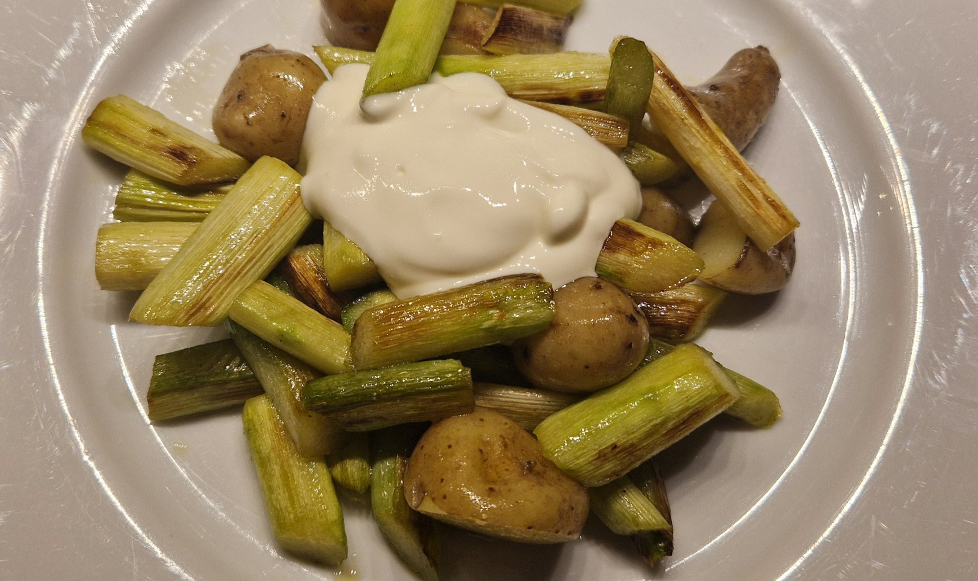 Hatte noch ein paar Pflanzkartoffeln Amandine übrig, die ich nicht mehr untergebracht hab und die ich unbedingt probieren wollte: Grüner Spargel in Butter gebraten, Kartöffelchen gekocht und in der Butter mitgeschwenkt, dazu einen Klecks Sauerrahm. Die sind wirklich lecker
