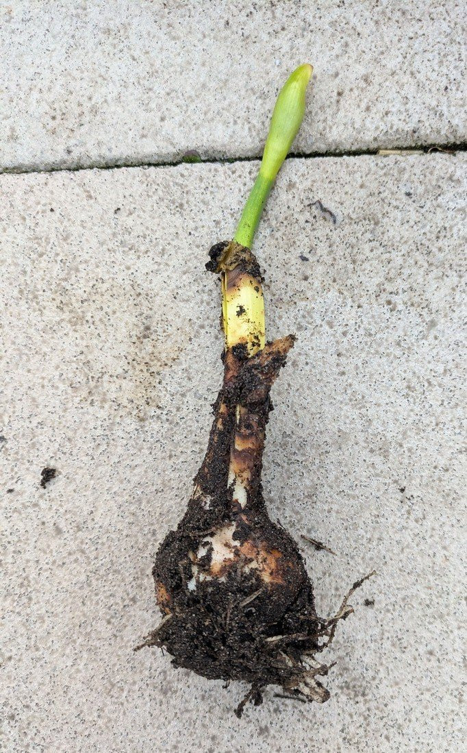 Ich hatte im Vorgarten auch so eine steckengebliebene Narzisse und ein paar Krokusse mit gleichem Anzeichen entdeckt. Die Zwiebel war ebenfalls fest, trotzdem habe ich sie lieber entsorgt. Den Auslöser kenne ich nicht, vielleicht war's zu nass...