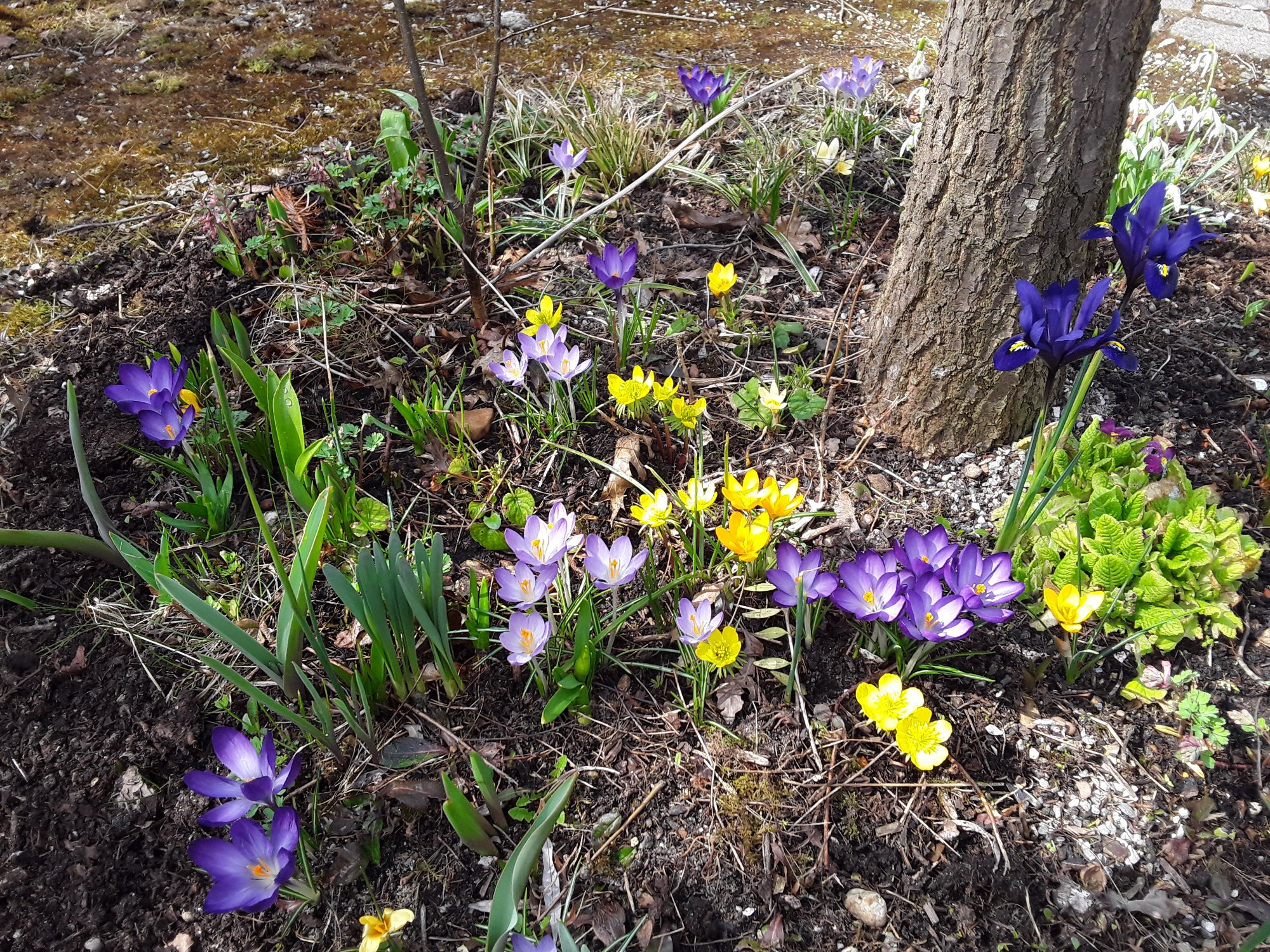 Ich überlege jedes Jahr, ob ich diesen extrem üppigen Pulk mit 'Carlton' im Hangbeet etwas besser verteilen soll, aber irgendwie ist's ja auch ein Hingucker, also bleibt erstmal alles so, wie es ist. Die 'Tête-à-Tête' unter der Haselnuss werden nicht wirklich mehr, aber sie halten sich gut und zaubern einen netten gelben Teppich mit Blütensternen an diese Stelle, wo sonst kaum etwas wachsen will. Wahnsinnig üppig geworden ist auch das Lungenkraut unter Hamamelis 'Jelena', erst letztes Jahr gepflanzt, sind die im Garten gesammelten Sämlinge bereits richtige Büsche geworden, die über und über blühen. Die Baumscheibe um meine kleine Fothergilla ist erstmal mit ein paar Alibi-Krokussen bestückt, hier muss ich mir noch eine Unterpflanzung überlegen.