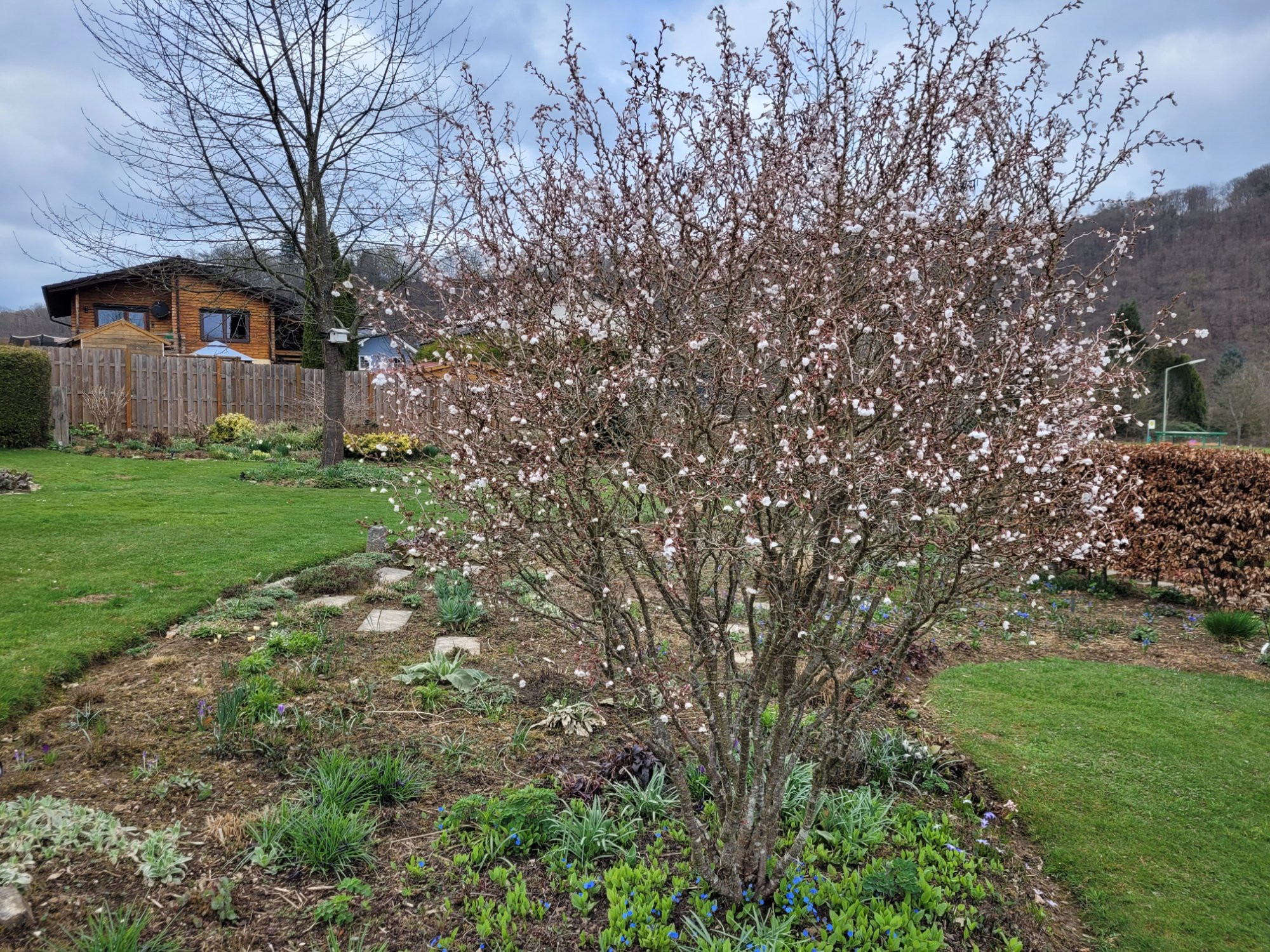 Hier beginnt Prunus inchisa Kojou- no- May jetzt mit der Blüte, schon eifrig von Hummeln umschwirrt.