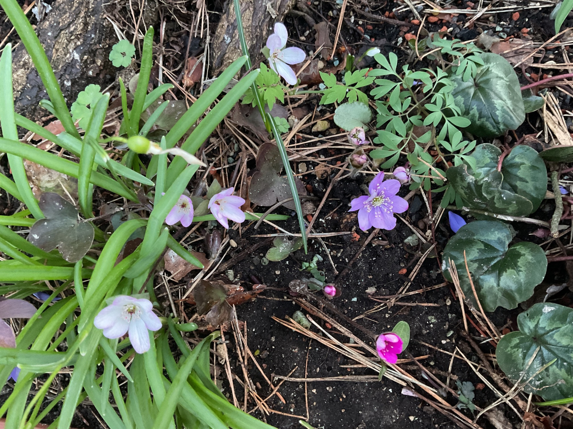 Was meinst du mit Konkurrenz? Schneeglöckchen oder Cyclamen? Von denen war nichts zu sehen, als ich die Hepatica versenkt habe. Die größte Konkurrenz dort ist der Fünffingerwein, der jedes Jahr das Haus verschlingt.