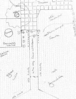 Ach ja auf dem Foto schaut man nach Süden, die Pläne sind "north-up" gezeichnet wie es sich für Karten gehört.23.28 ergänzt:Jetzt hab ich noch was versucht wegen des Plans wenn das klappt lösch ich oben den zu kleinen Plan.Schwarze Punkte zwei Rosmarin, rote Kreise Rosen und grüne Punkte Lavendel.