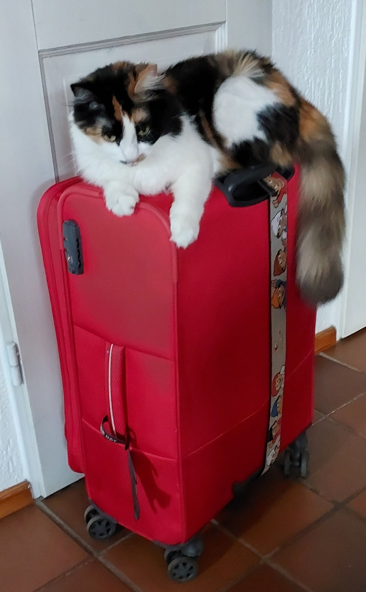 Sie springt sofort an und auf meinen Koffer und bleibt da! Dieser Koffer bleibt hier, meint sie wohl! Später weicht sie nicht mehr von meiner Seite und ähemm..... hat auch mein Bett erobert