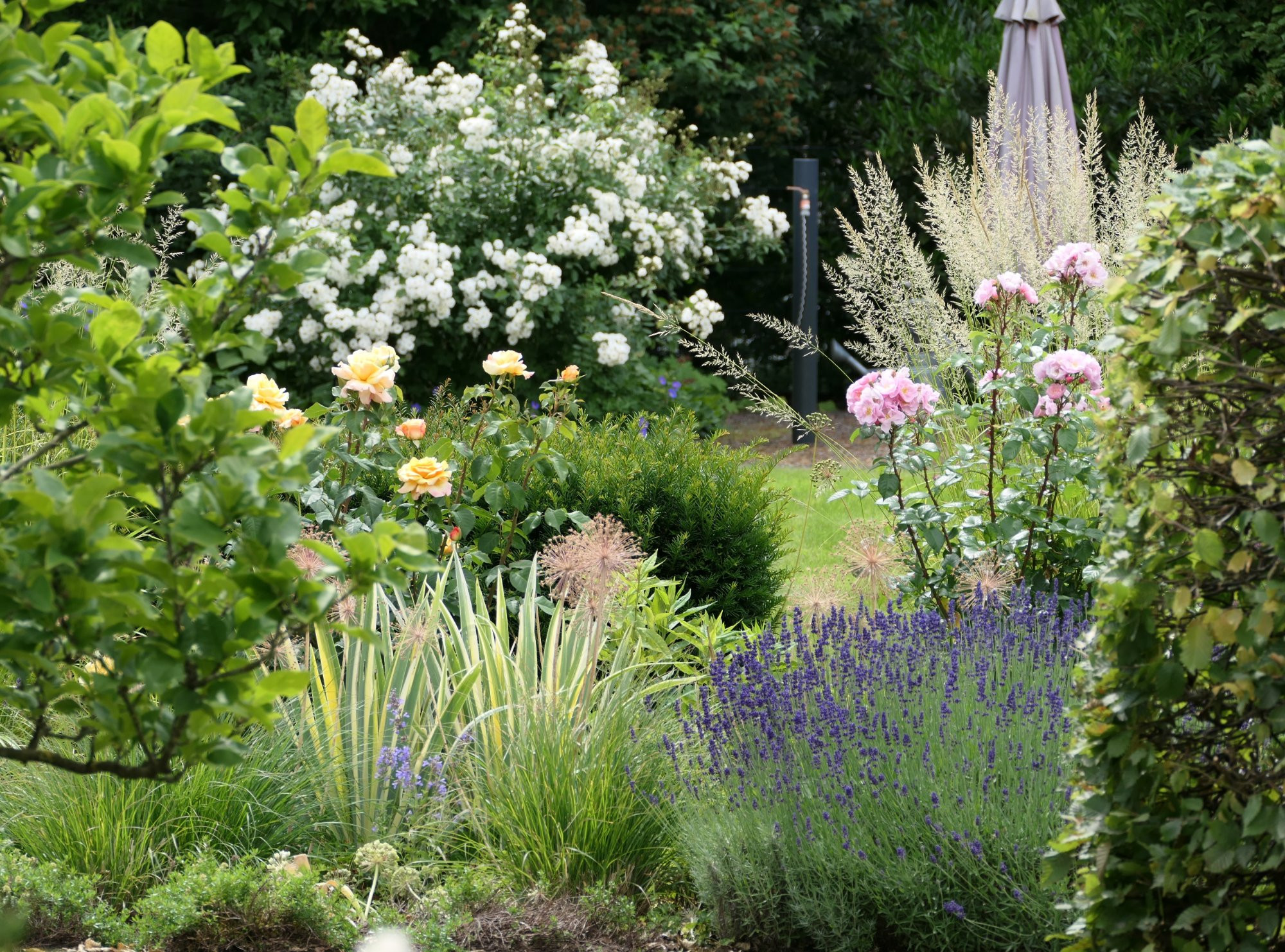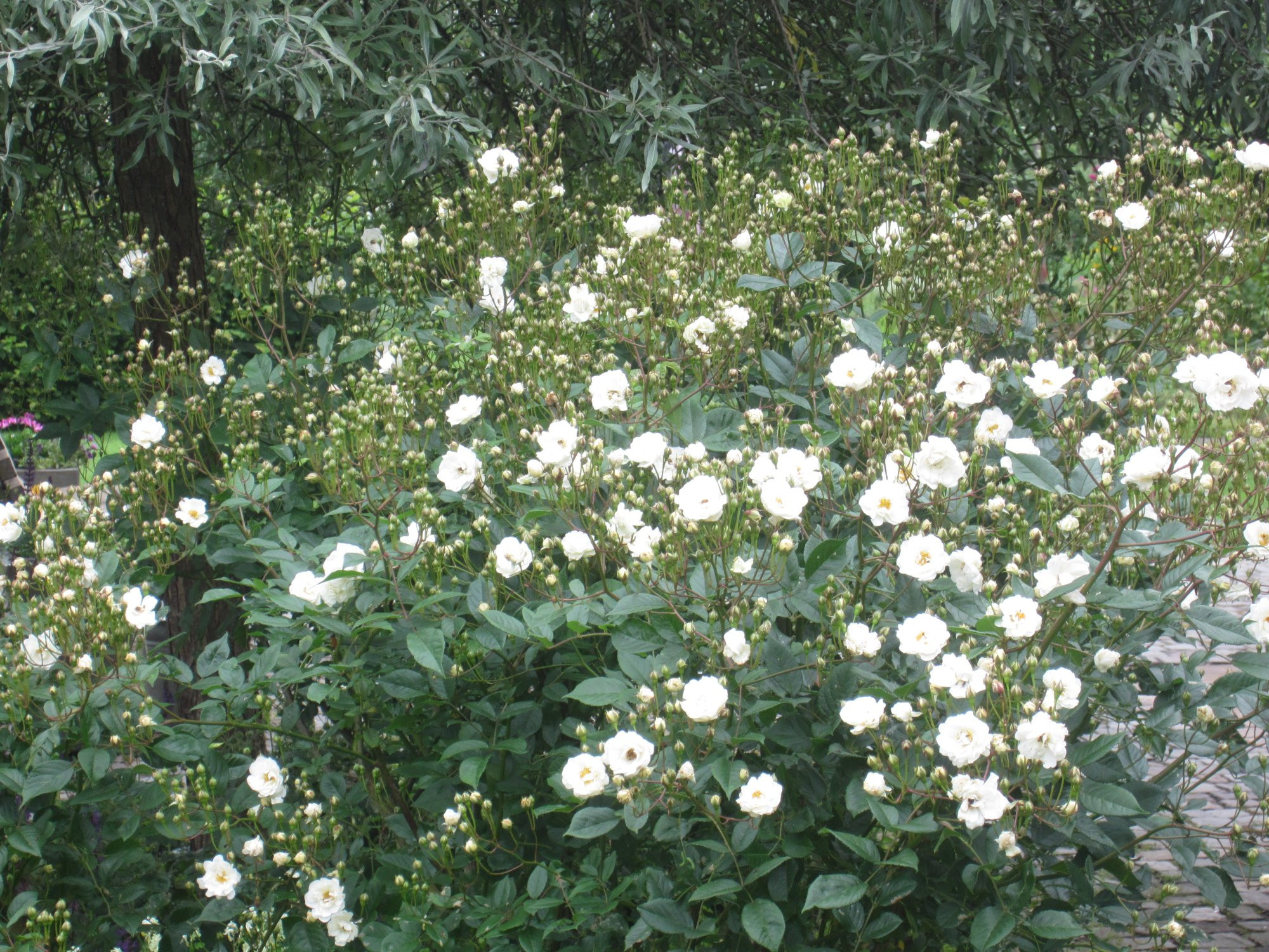 Vielleicht bleibst Du doch eher bei den öfter blühenden "Bodendecker Rosen" ? Auch die lassen sich gut als kleinere Sträucher halten, wie diese ... das ist 'Schneeflocke' von Noack. Seit vielen Jahren halte ich drei davon zuverlässig hier im Westbeet auf etwa 0,80 bis 1m Höhe. Vielleicht nichts spektakuläres, aber zuverlässig und reich blühend, bienenfreundlich ungefüllt und mit leichtem Duft. Ich kombiniere Rosen inzwischen lieber auch mit Stauden und Gräsern ... :D