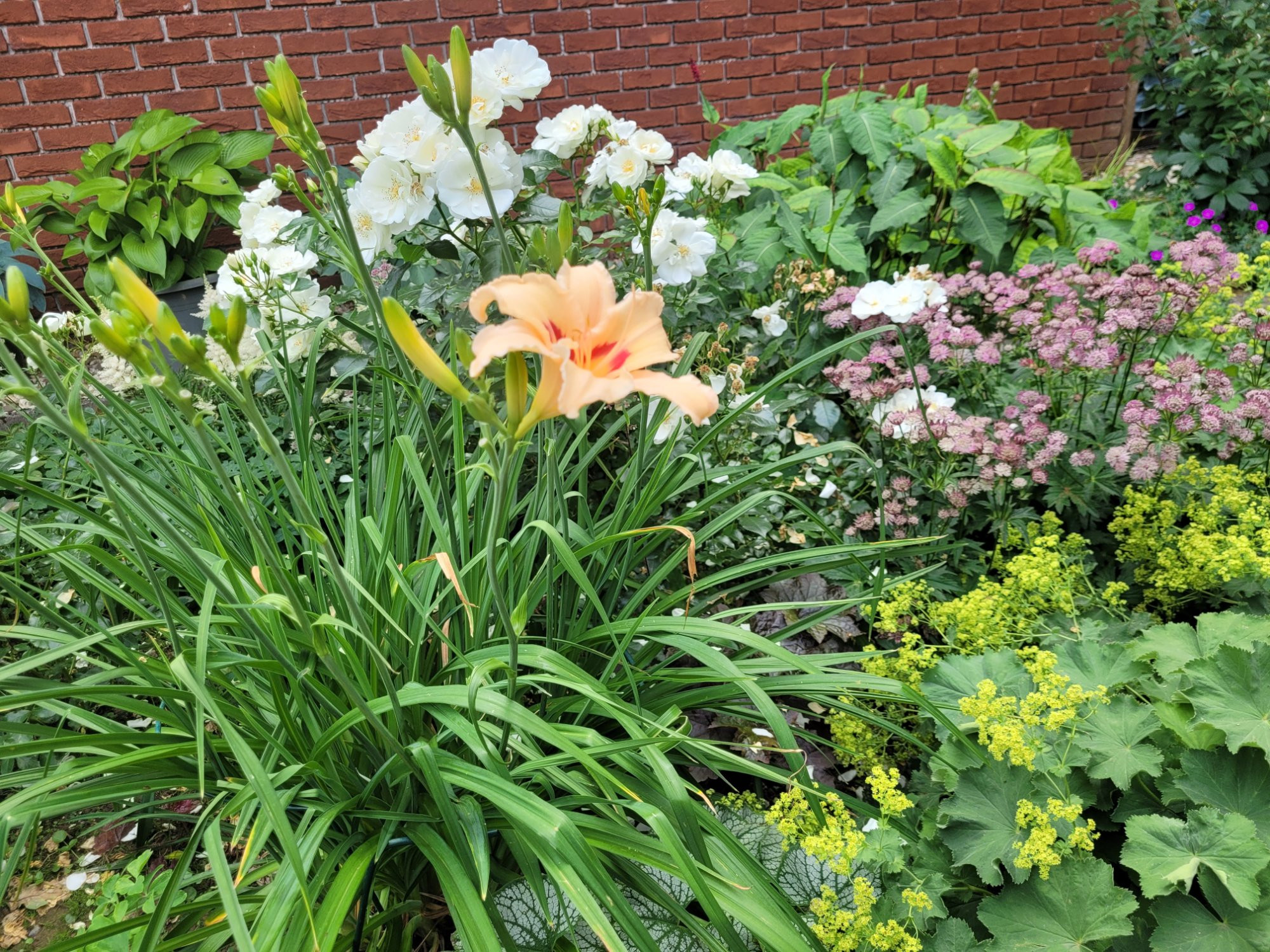 Besonders schön und die ganze Saison blühend ist Tall Story, sie öffnet die Blüten aber gelb und verblasst in wenigen Stunden. Am Foto nicht von den gelben Blüten der Lady Hillingdon links verwirren lassen.