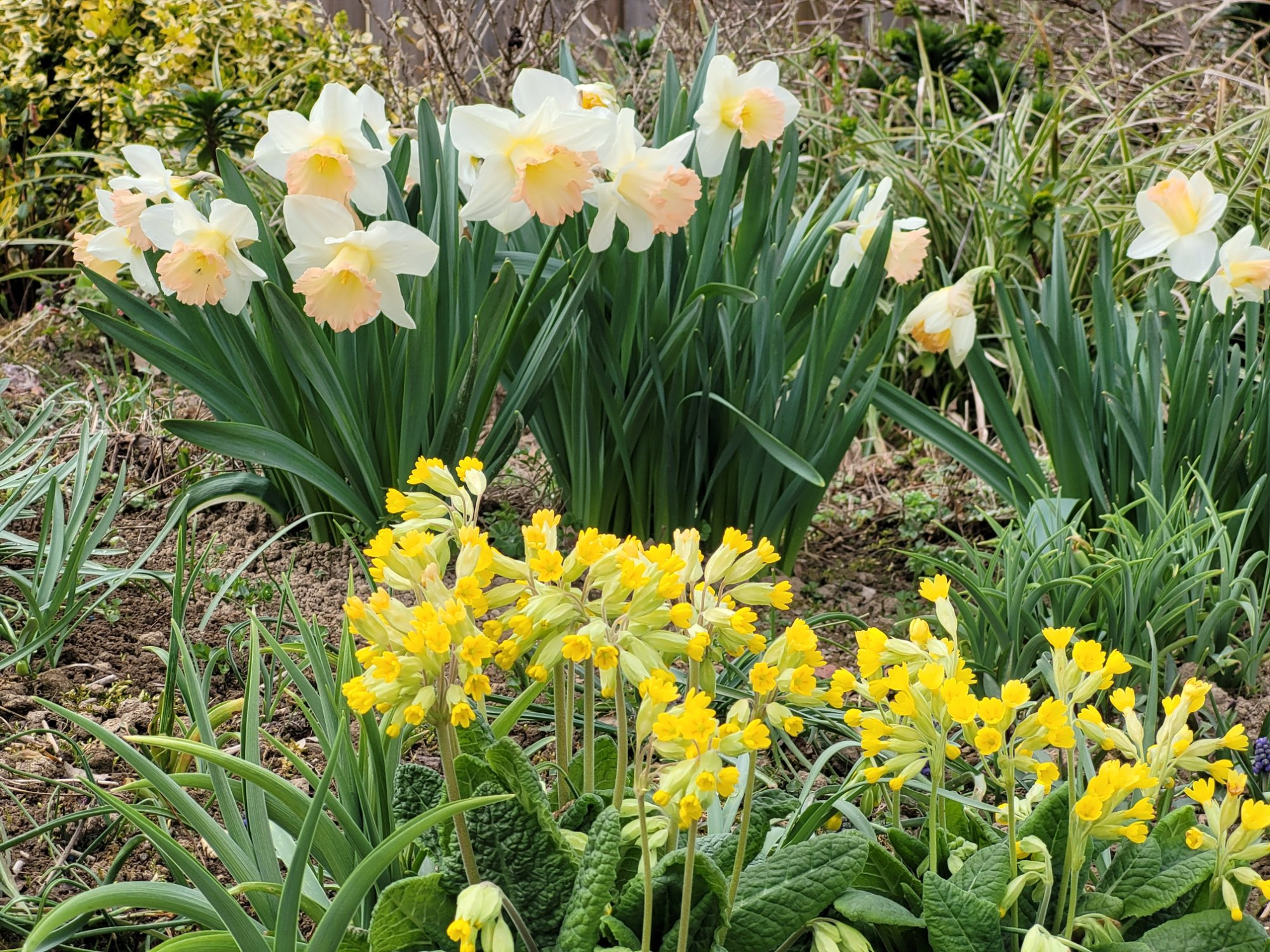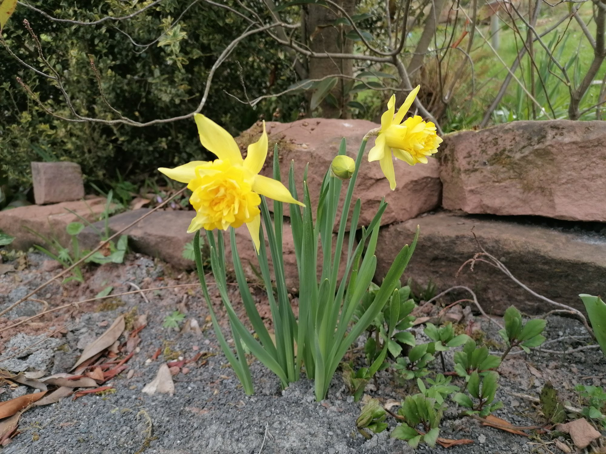 von fluwel gab es letztes jahr leider eine fehllieferung oder beim hollandtagkauf bei hoch eine fehleintütung, jedenfalls blühte hier inzwischen in der rochadereihenpflanzung im gemüsebeet irgendeine frühe auffällig niedrige ggf. cyclamineusbeeinflusste proppere hybride in quietschgelb mit gelborangem röhrenperianth – in der form nicht meins, aber immerhin farblich ok. die pflanzen setzte ich heute ins wallbeet richtung kolonieweg um, sollen sie die spaziergängi erfreuen, so muss ich sie vom garten aus nicht sehen.
