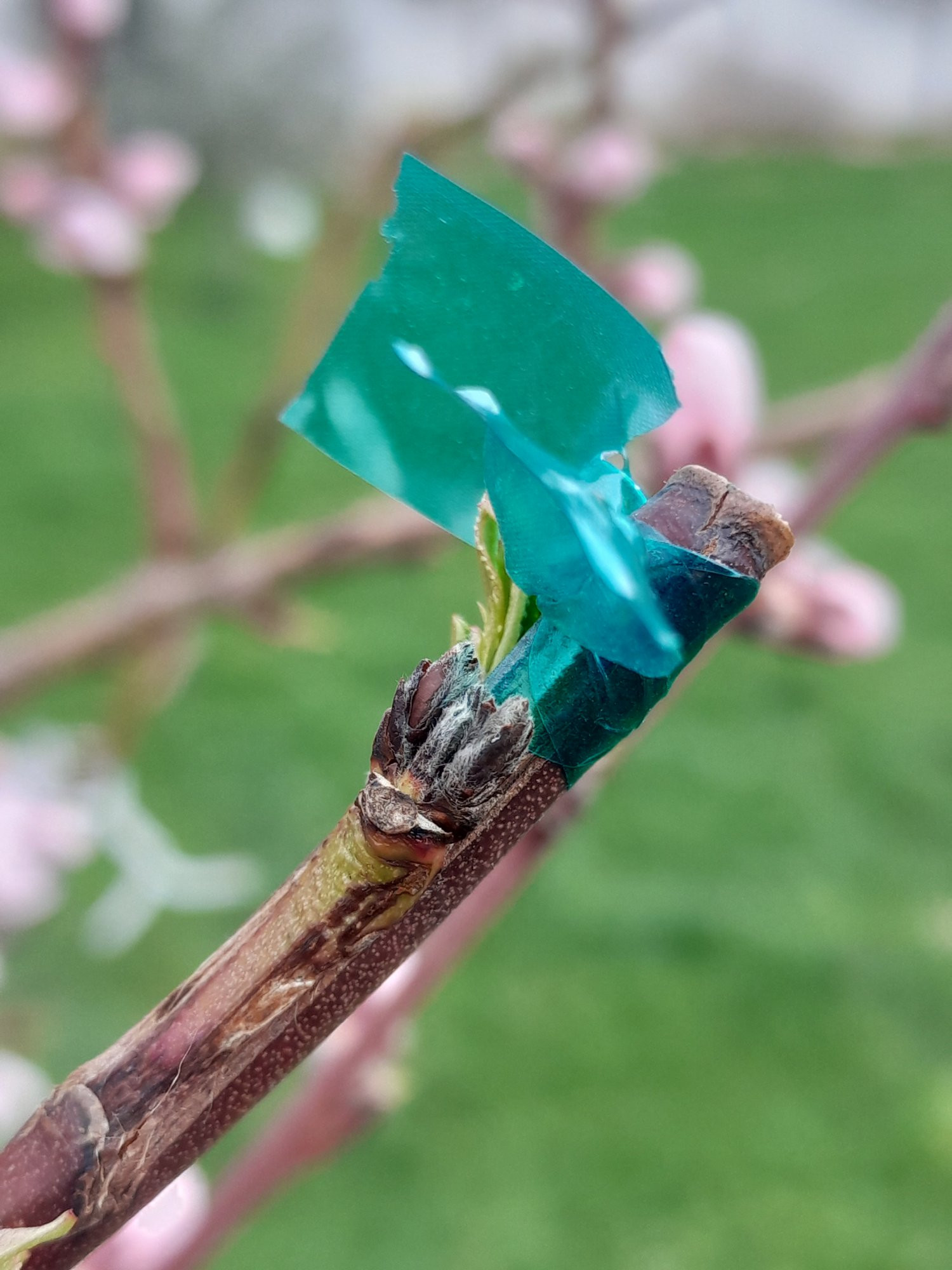 Bei einer Okulation mit Mirabelle auf Wavit versiegelt mit Latexschnellverschluss hatte sich das Schildchen beim Anwachsen von der Unterlage weggedrückt und war lange Zeit nur einseitig angewachsen auf der anderen Seite ein offener Spalt. Darüber hatte ich die Unterlage erst als Zapfen später mit weiterem Einkürzen abgeworfen. Irgendwann war das Ding übern Berg, letztes Jahr nochmals verpflanzt ist die Mirabelle trotz suboptimaler Okulation jetzt bei zweifünfzig Höhe und blüht zum ersten Mal. Eine Spindel, die ersten Äste auf ca. 55 cm.