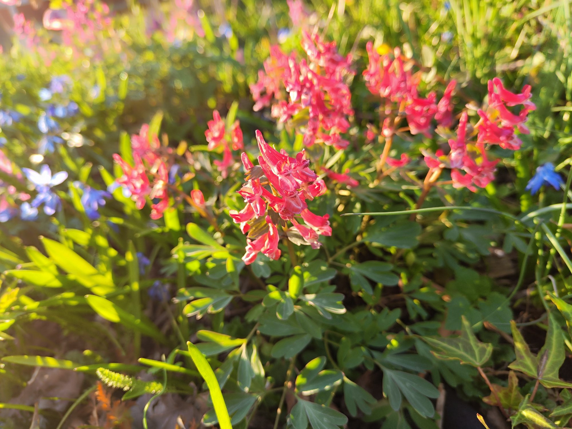 Traubenhyazynthen mit Corydalis , farblich durchaus harmonierend . Narzissen, die sich zwischen Gehölzen und liegengebliebenen Schnittgut behaupten. Leberblümchen.