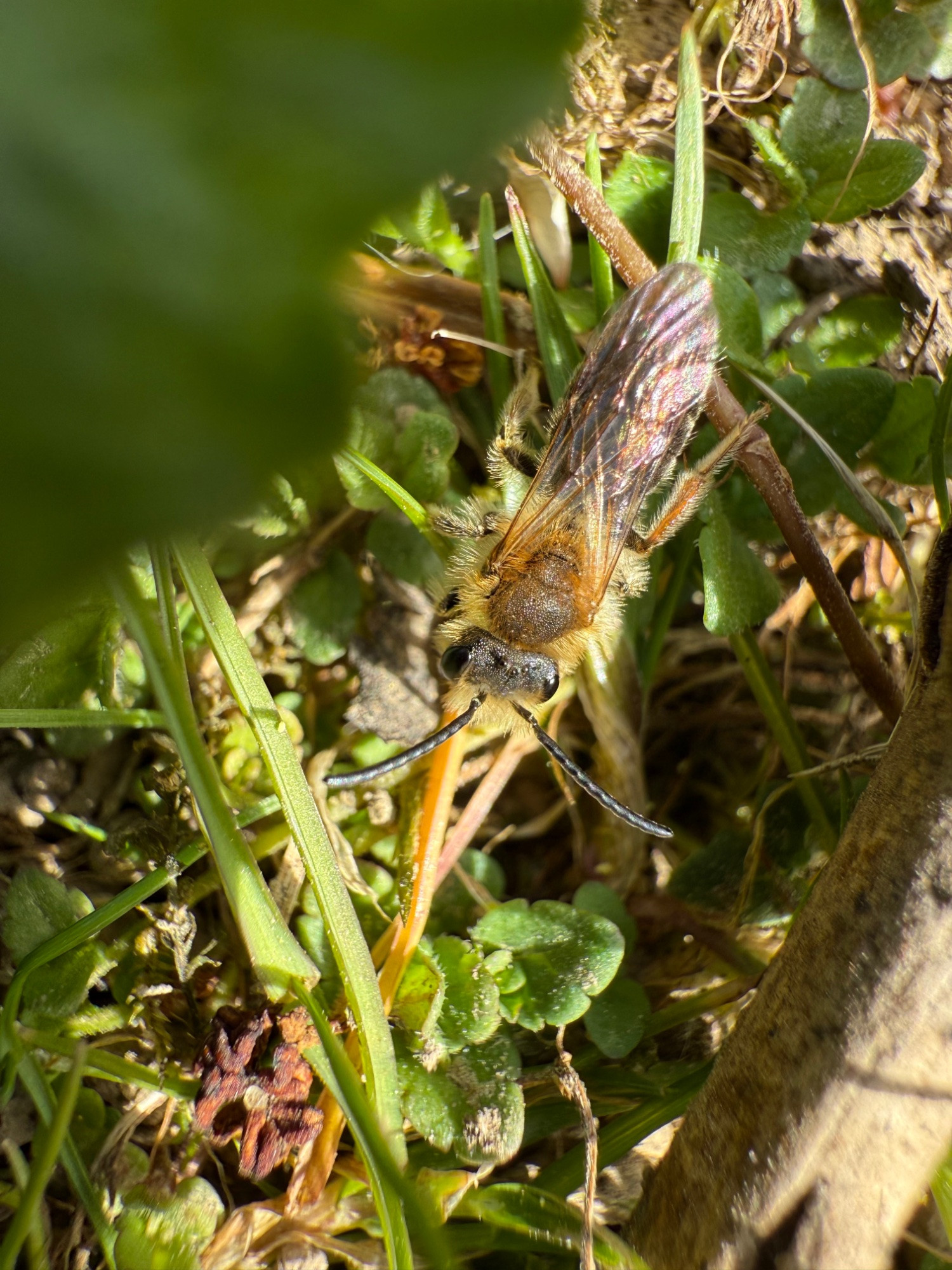 Das Sollte Andrena Bicolor sein zurzeit sehr inflationär anzutreffen und geht an alle möglichen Pflanzen Narzissen, Krokusse und Co: