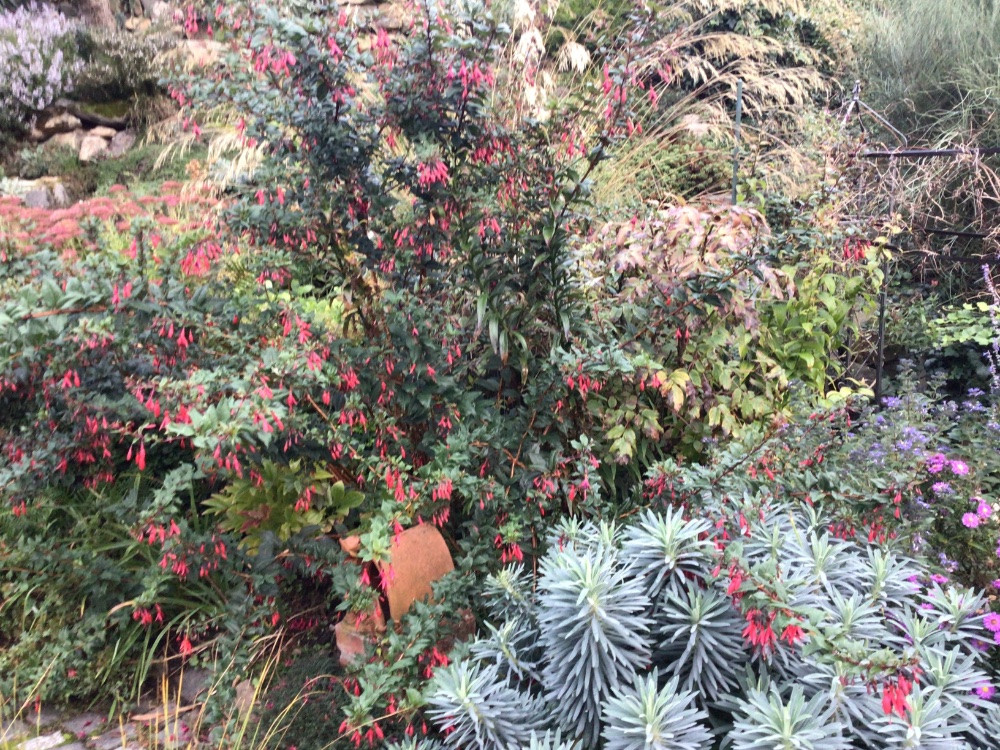 Meine Fuchsie ist in diesem Jahr auch größer als sonst. So ca. 2x2 Meter obwohl sie im Frühling bodennah zurückgeschnitten wurde. Eigenartiger Weise hat der Spätfrost an den Neutrieben keinen Schaden angerechtet wobei der Wurmfarn in der Nähe starke Frostschäden hatte. Die Sorte kenn ich nicht, die Pflanze wird richtig schön erst im Herbst, Wärme scheint sie nicht zu mögen.