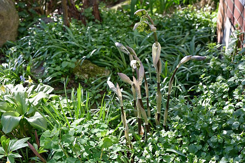 Geht man die Treppe nach unten, trifft man auf meinen kleinen "Felsengarten" mit den Farnen, die nun so langsam ihre neuen Wedel entrollen. Auch Hakonechola macra treibt nun wieder aus, so dass die kleinen Lücken dort bald wieder gefüllt sind. Die weißen Blüten von Brunnera und Pachyphragma macrophylla sowie die blau-roten Tupfen von Pulmonaria und die leuchtend gelben Blüten von Corydalis cheilantifolia erhellen den Schatten ebenso wie der gelbgrüne Austrieb von Lamprocapnos spectabilis 'White Heart'. Herrlich blüht auch Helleborus orientalis 'Conny' auf der anderen Seite des Wegs, zusammen mit Pachyphragma sowie weißen und blauen Primeln zu ihren Füßen.