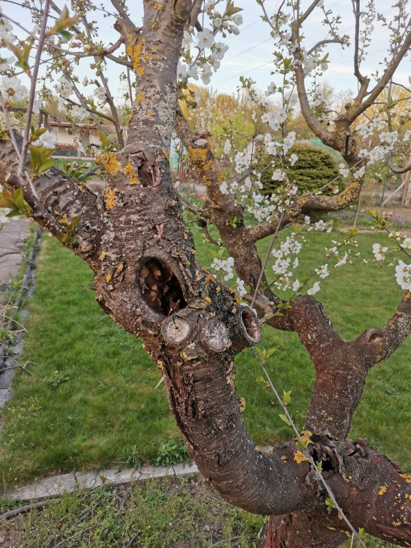 Ich bin heute nochmal extra in einen anderen garten gelaufen, die Sauerkirsche ist jetzt keine Reneklode oder Zwetschgenartiges, aber immerhin Steinobst, damit halbwegs vergleichbar. Ich schneide die seit Jahren, dieses Jahr vielleicht etwas wenig, aber ich versuche sie wüchsig zu halten durch den Schnitt, damit die Fäule eben einfach überwachsen wird. Bei Bäumen ist das lebende und damit relevante Holz eben außen, nicht innen. Ich möchte nur die Angst vor den eindrucksvollen Löchern nehmen. Die sind zwar auffällig, aber beherrschbar.