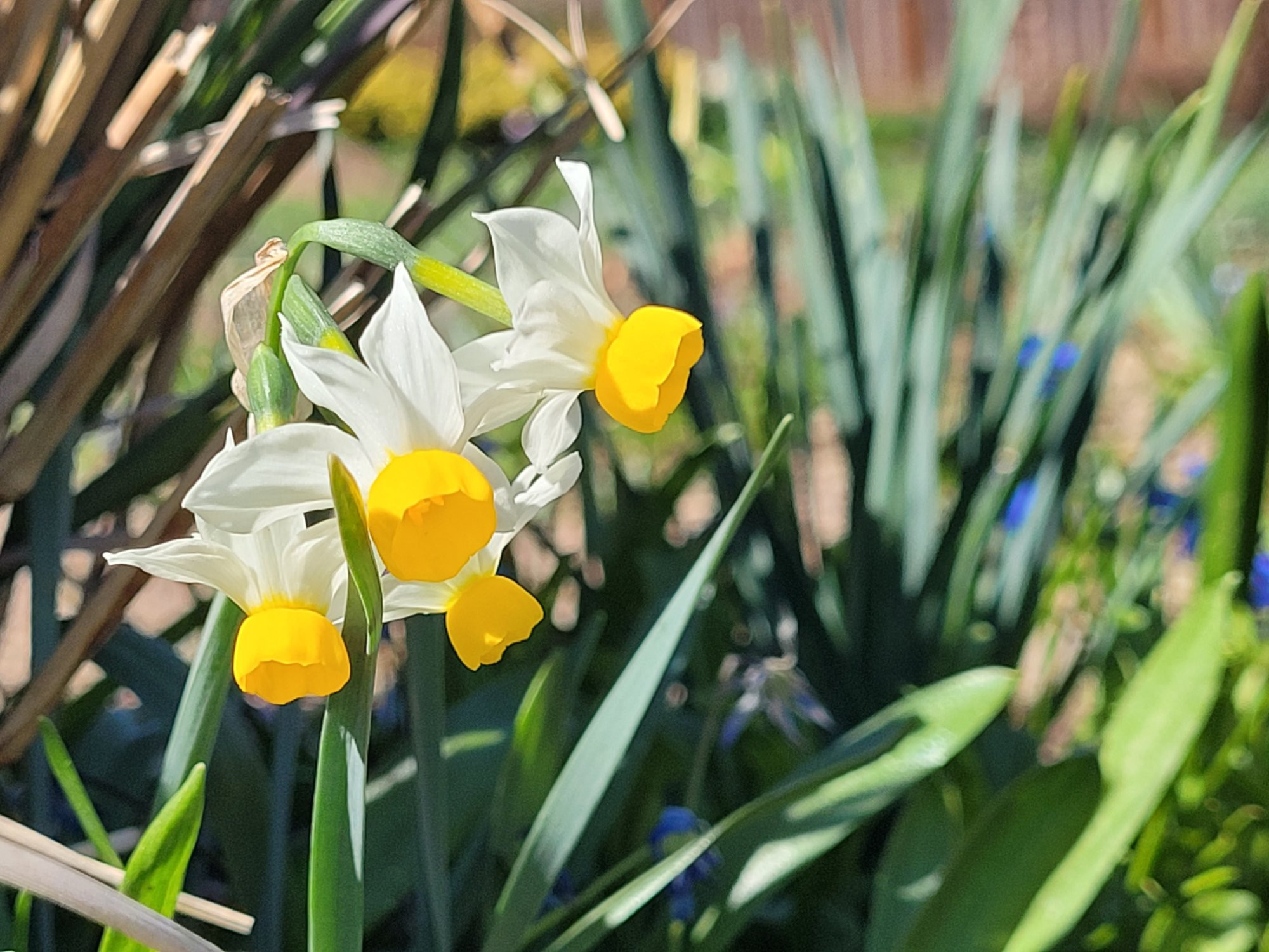 Die erste Narzisse, die in meinem Garten blüht, ist 'Peeping Tom', und sie blüht heute noch unverdrossen und makellos. :D Dabei sind 'Jetfire', 'February Silver' und eine weiße mit kurzer orangefarbener Krone, die ich nie gekauft habe (evt. 'Barrett Browning'?).