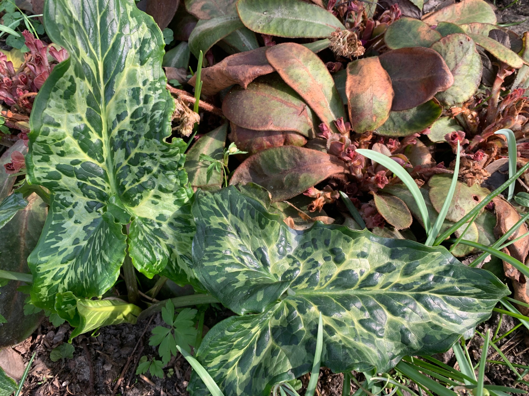 Bei den großblättrigen Arum italicum musste ich nach dem Schnee und den Frösten doch einige Blätter abtrennen. Ein geschützter Platz wirkt Wunder wie ‚Hungarian Rapsody‘ zeigt. Wir hatten heute Nacht wieder Frost.