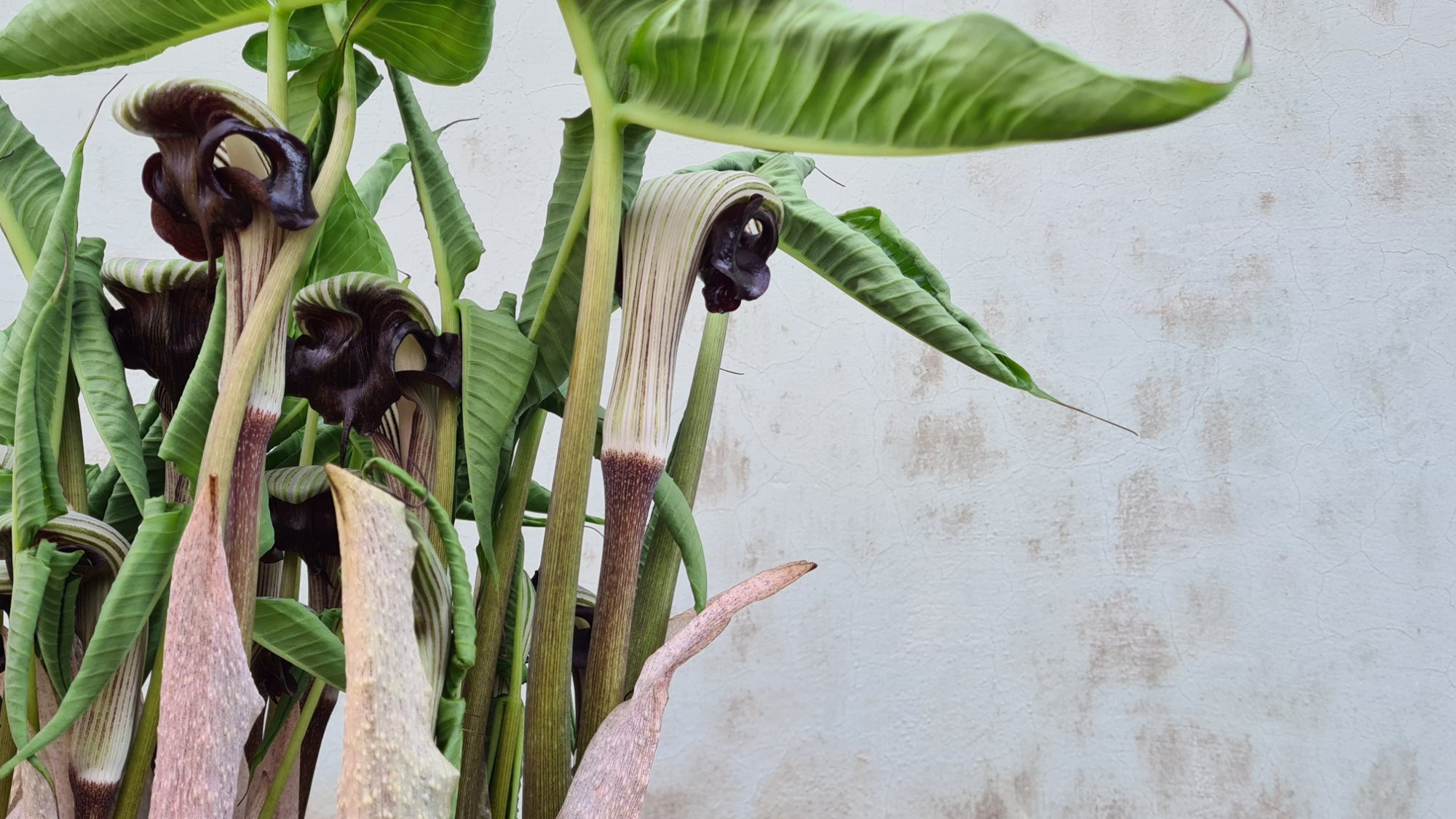 Arisaema ringens blüht, allerdings im Topf und frostfrei überwintert.