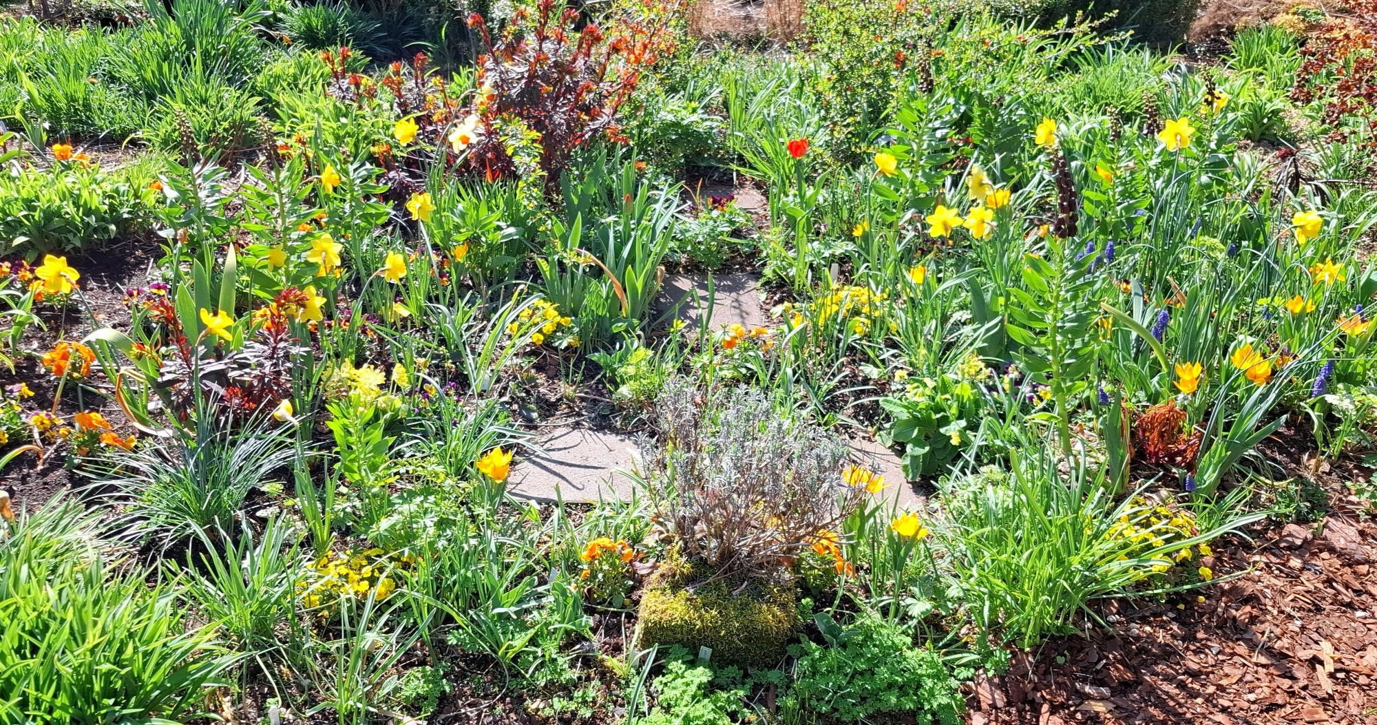Hier mit Frühlingszukauf Hier mit Zwiebeln im Herbst gesetzt