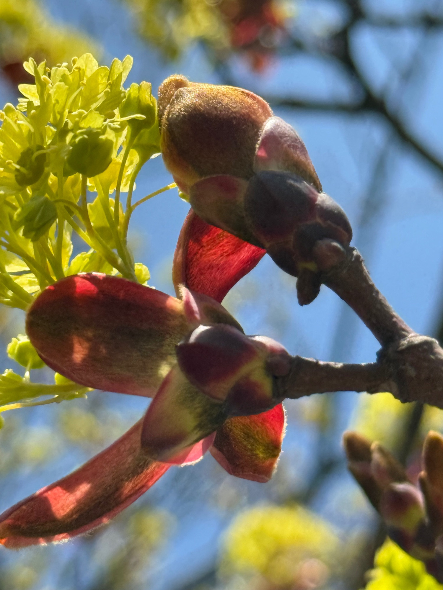 Spitzahorns auch dieses nette Detail mit den roten Akzenten der geöffneten Knopsen