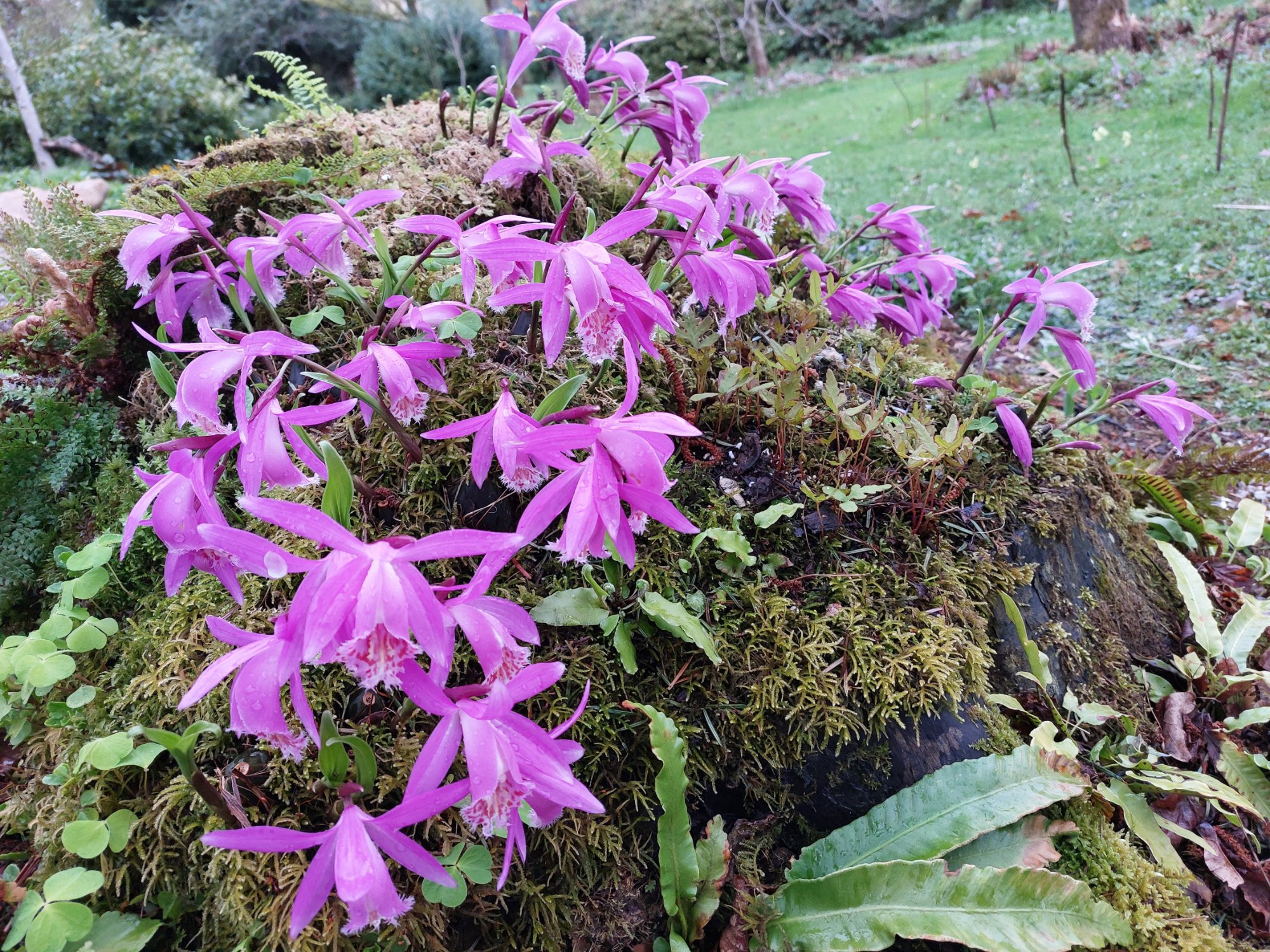 Meine Pleionen „säen“ sich von der Lavatuffmauer in die Fugen der Hofplatten aus :o 8)