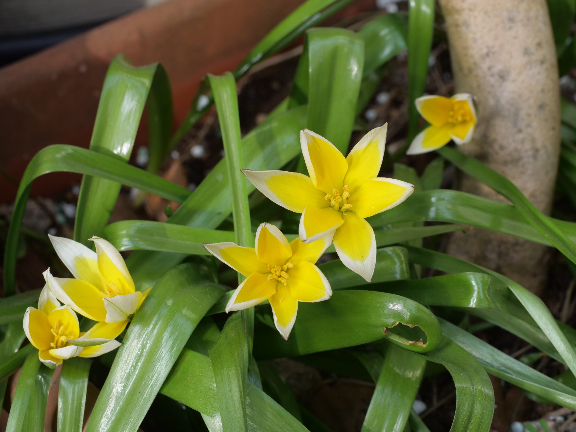 Die Zwiebeln dieser kleinen Tulpe habe ich vor vielen Jahren aus einer abgeblühten Schale mit Frühlingsblumen gerettet und mangels einer besseren Idee in den Kübel mit dem Olivenbäumchen gesteckt. Seither kommen sie ganz treu jedes Jahr wieder zur Blüte. (Tulipa tarda ?)