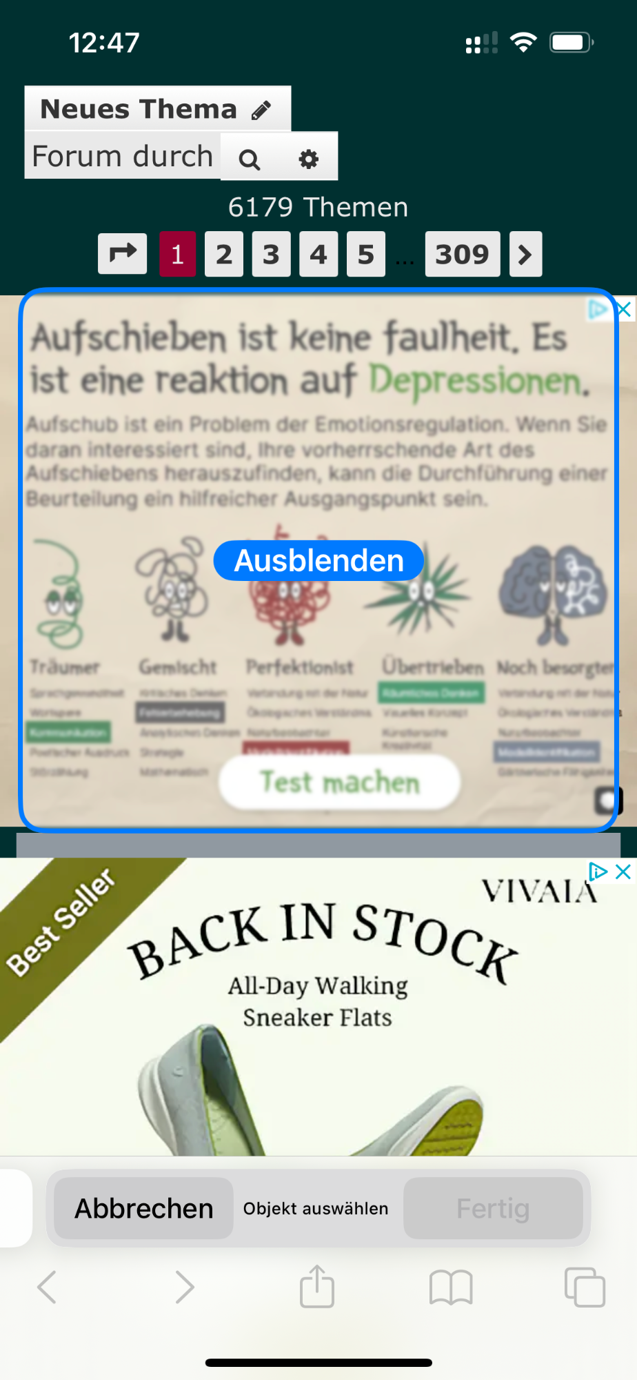 Außerdem noch ein Tipp von mir, wenn der Bildschirm voller Werbung ist (wie auf dem Screenshot), dann einfach mal ein reload der Seite machen. Das ist das Symbol rechts unten mit dem Kreispfeil. Dann sieht der Bildschirm meist anders aus und man kann wieder scrollen und klicken.