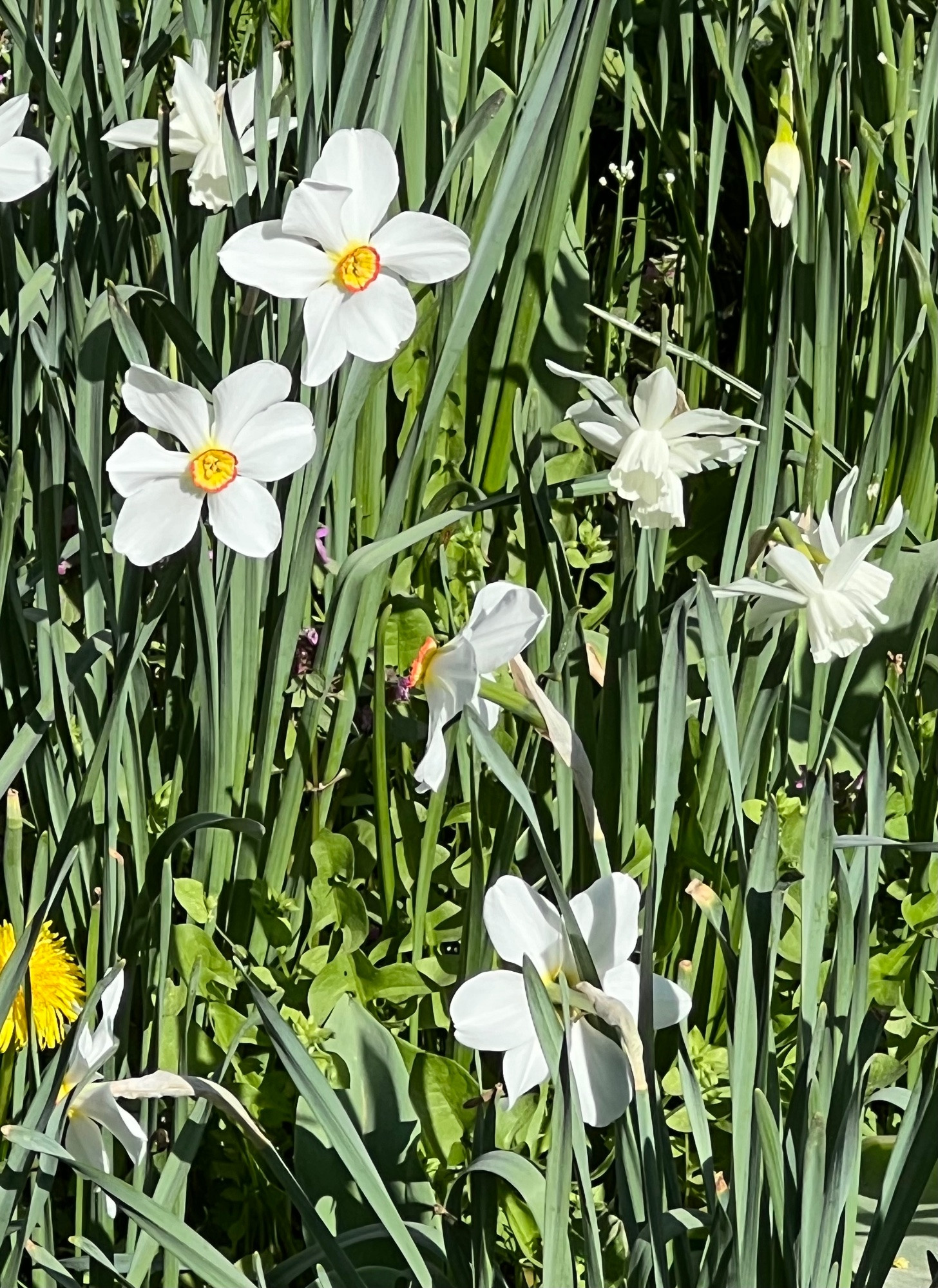 Ich mag die jetzt erst blühenden, hellen Narzissen fast noch lieber. Allerdings sind sie hier tatsächlich nicht besonders wüchsig. Besagte Thalia hält sich zwar ganz gut, vermehrt sich aber auch nicht sonderlich. Es gibt bisher immer nur ein bis zwei Stängel, aber es wird kein Horst. Ich hatte mal eine ganze Menge davon ins Präriebeet gesetzt, wo sie sich zwar wacker hält aber kaum Wirkung entfaltet.