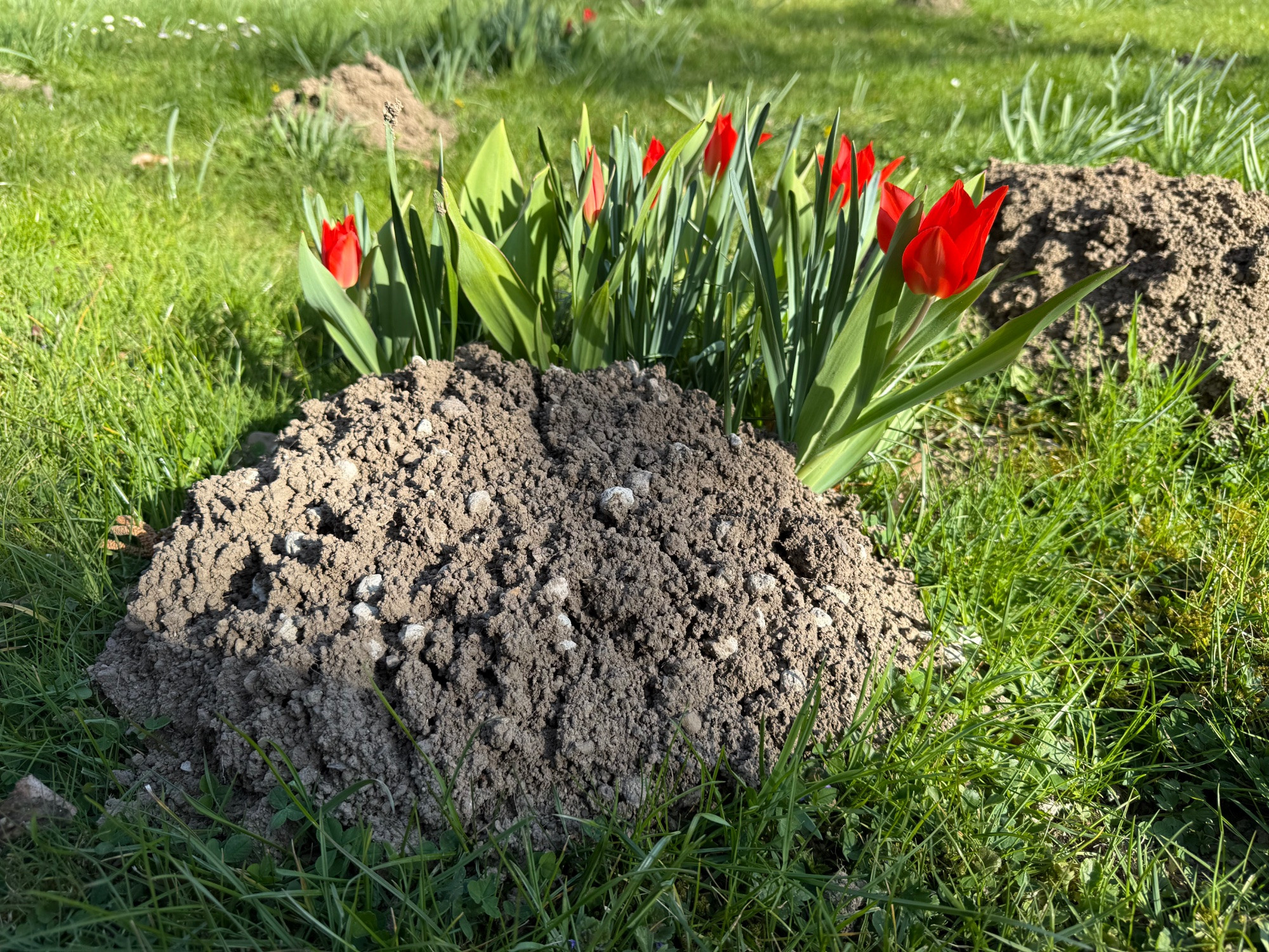 Die Aldi Tulpen blühen auch und das, obwohl ein Maulwurf das Lanz Loch ganz schön um gewühlt hat. Man sieht auch den Bims, den ich mit ins Pflanzloch gegeben habe