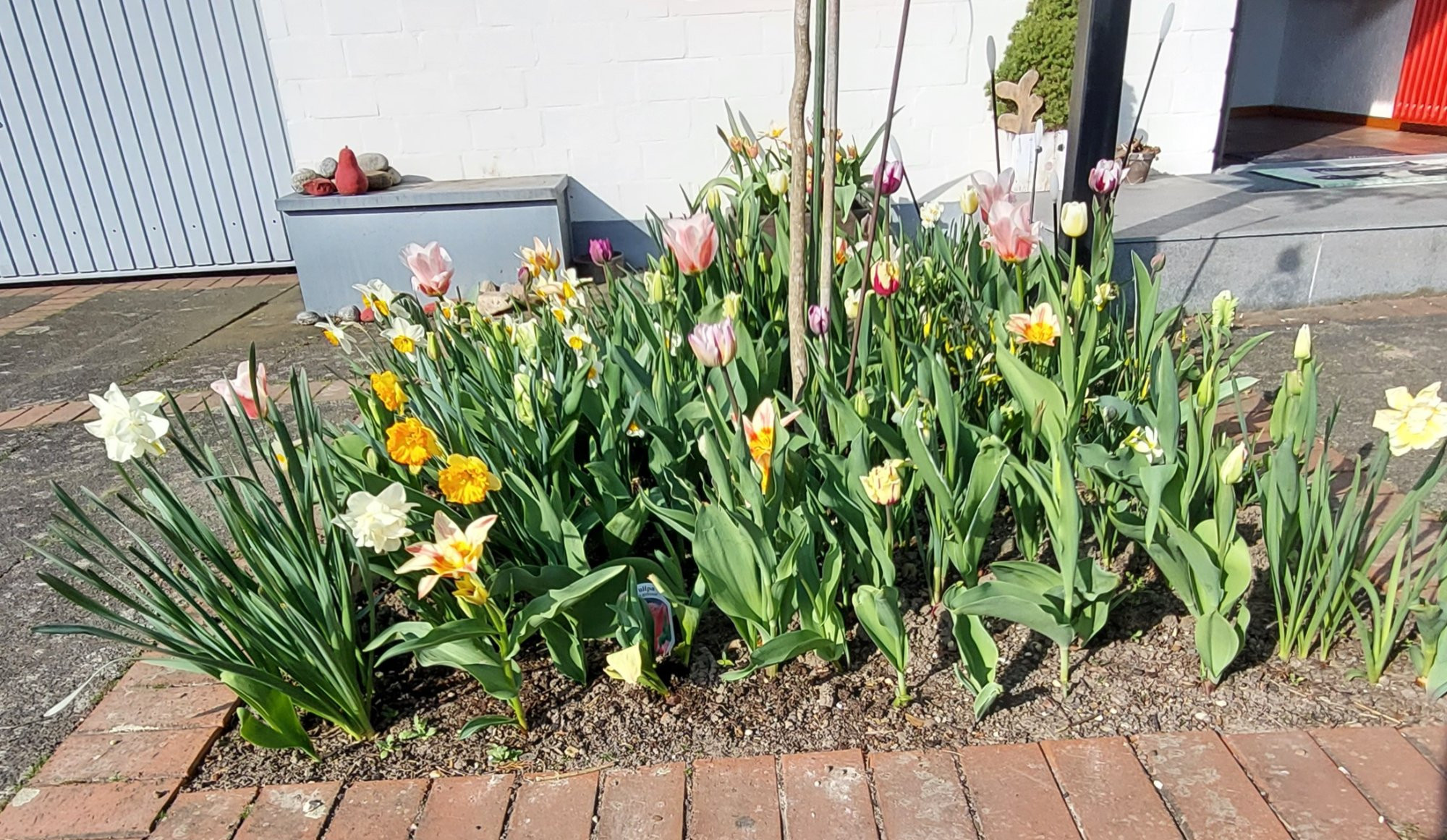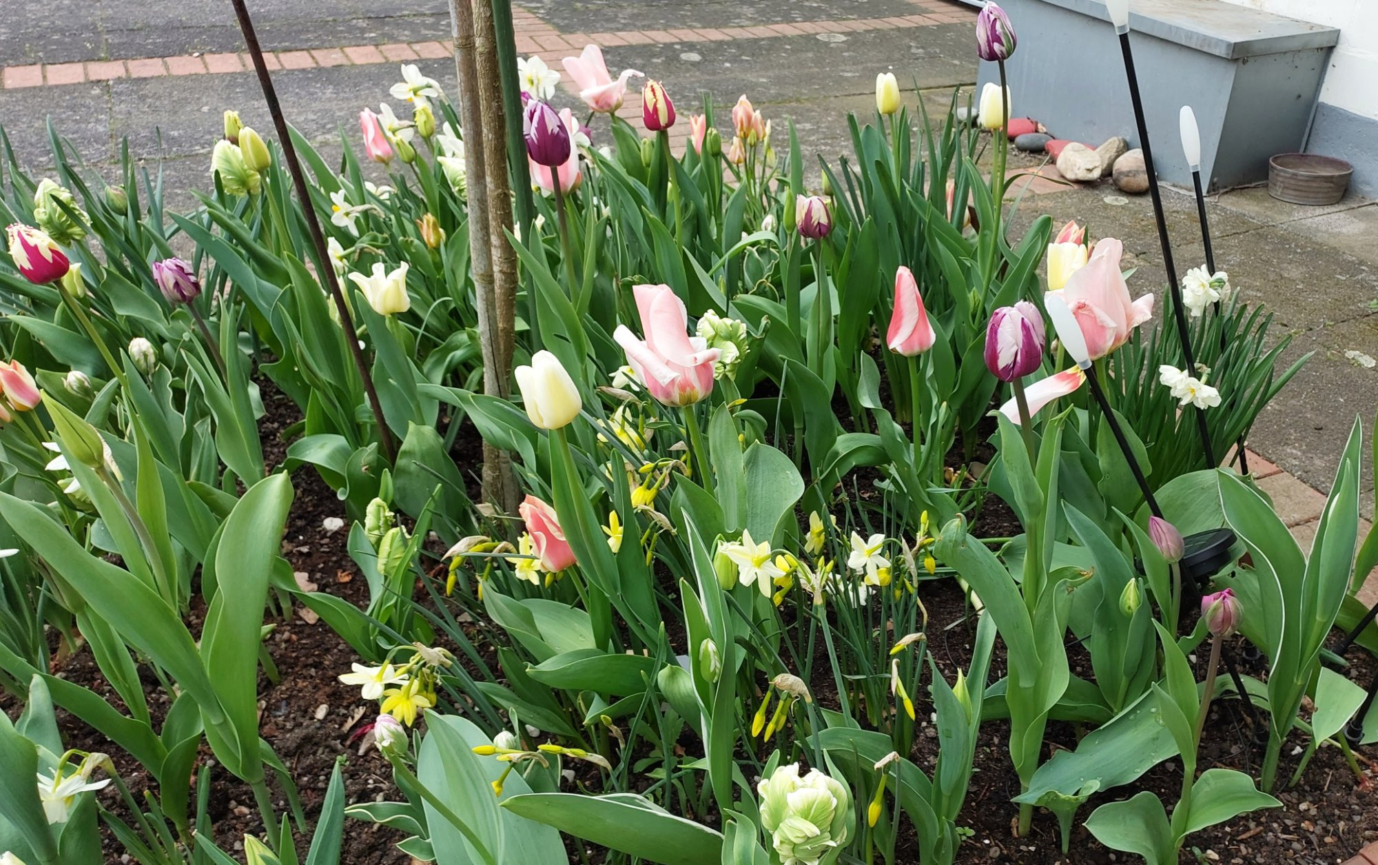 Gerade mache ich hier ein Experiment. Ich habe einige Tulpen in Blumenkübel gepflanzt. Aktuell stehen die Töpfe dort in den Beeten, wo sie gerade gut hinpassen. Nach der Blüte kommen sie ein wenig abseits an einen eher schattigen, trockeneren Platz und dort überwintern sie in den Kübeln. Mal schauen, wie sie nächstes Jahr blühen, mit gezielter Düngung und ohne Staunässe.