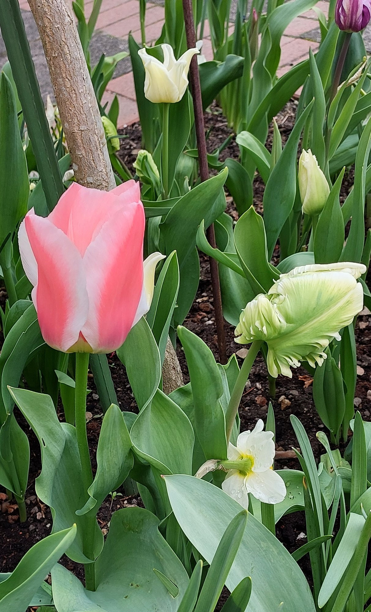 Und es kommen auch die ersten großen Sorten. Ich mag besonders gerne die lilienblütigen Tulpen. Davon habe ich so viele unterschiedliche gepflanzt, dass ich jetzt leider den Überblick über die Sortennamen verloren habe. Das hier könnte also Queen Rania sein oder vielleicht auch Marietta: