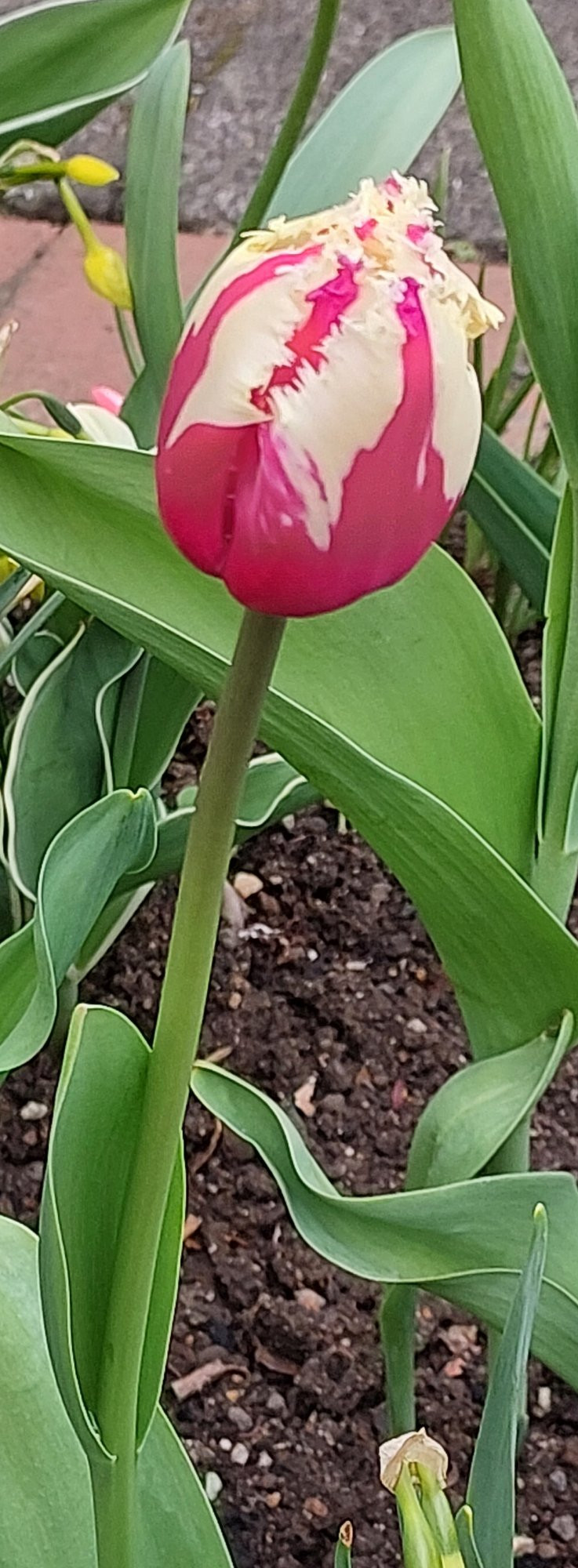 Die Aldi Tulpen blühen auch und das, obwohl ein Maulwurf das Lanz Loch ganz schön um gewühlt hat. Man sieht auch den Bims, den ich mit ins Pflanzloch gegeben habe