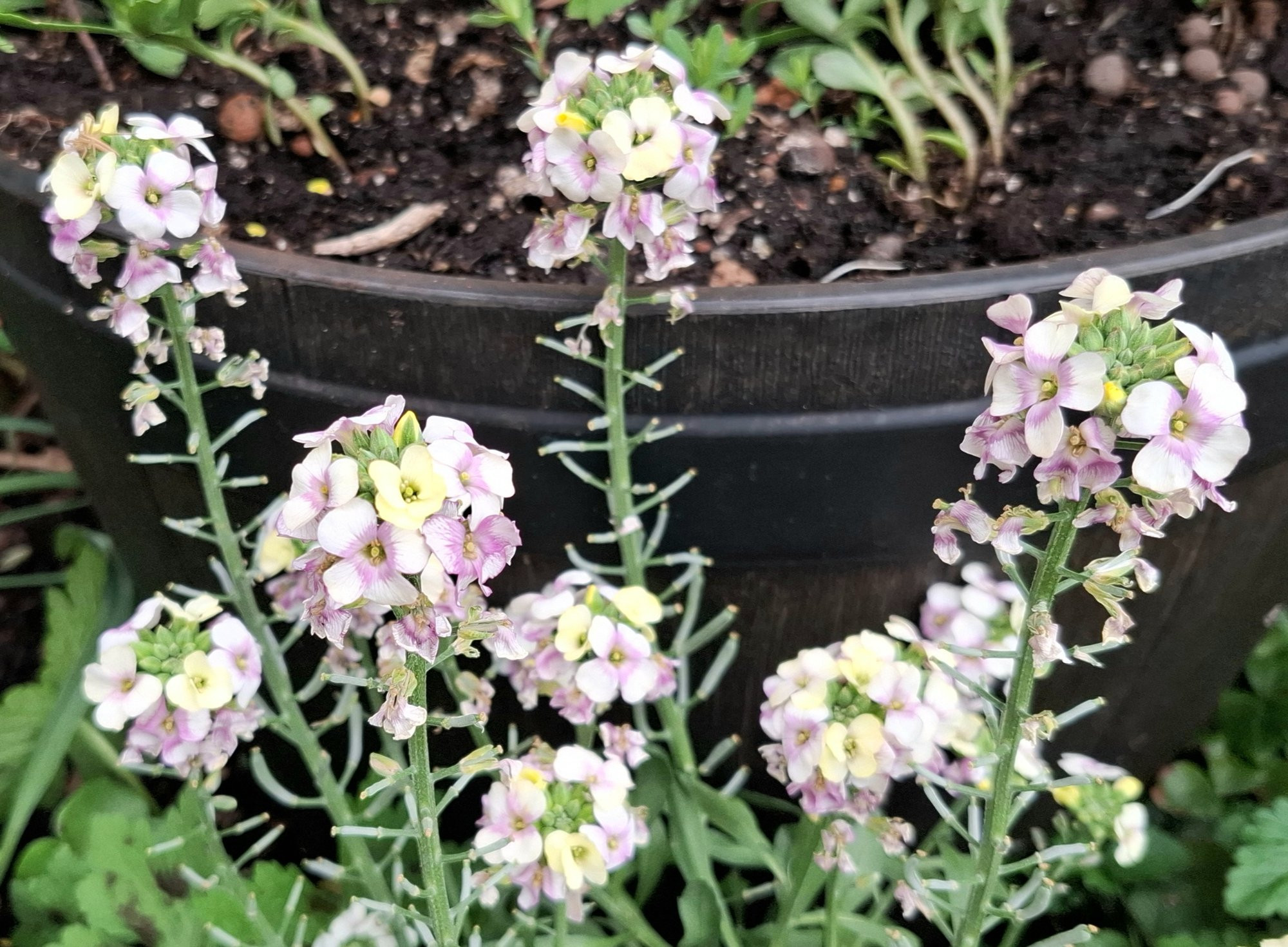 Neben Cardamine bulbifera, die sich hier eifrig vermehrt (aber momentan noch nicht blüht), ist Erysimum in den letzten Jahren sehr in meiner Gunst gestiegen. Die Pflanze - ich vermute eine Auslese oder Hybride aus Erysimum cheiri und E. pulchellum - ist ein ausdauernder, kompakter Halbstrauch. Sie ist nahezu immergrün - und fast immerblühend mit dufternden Blüten, die auch bei Insekten beliebt sind.