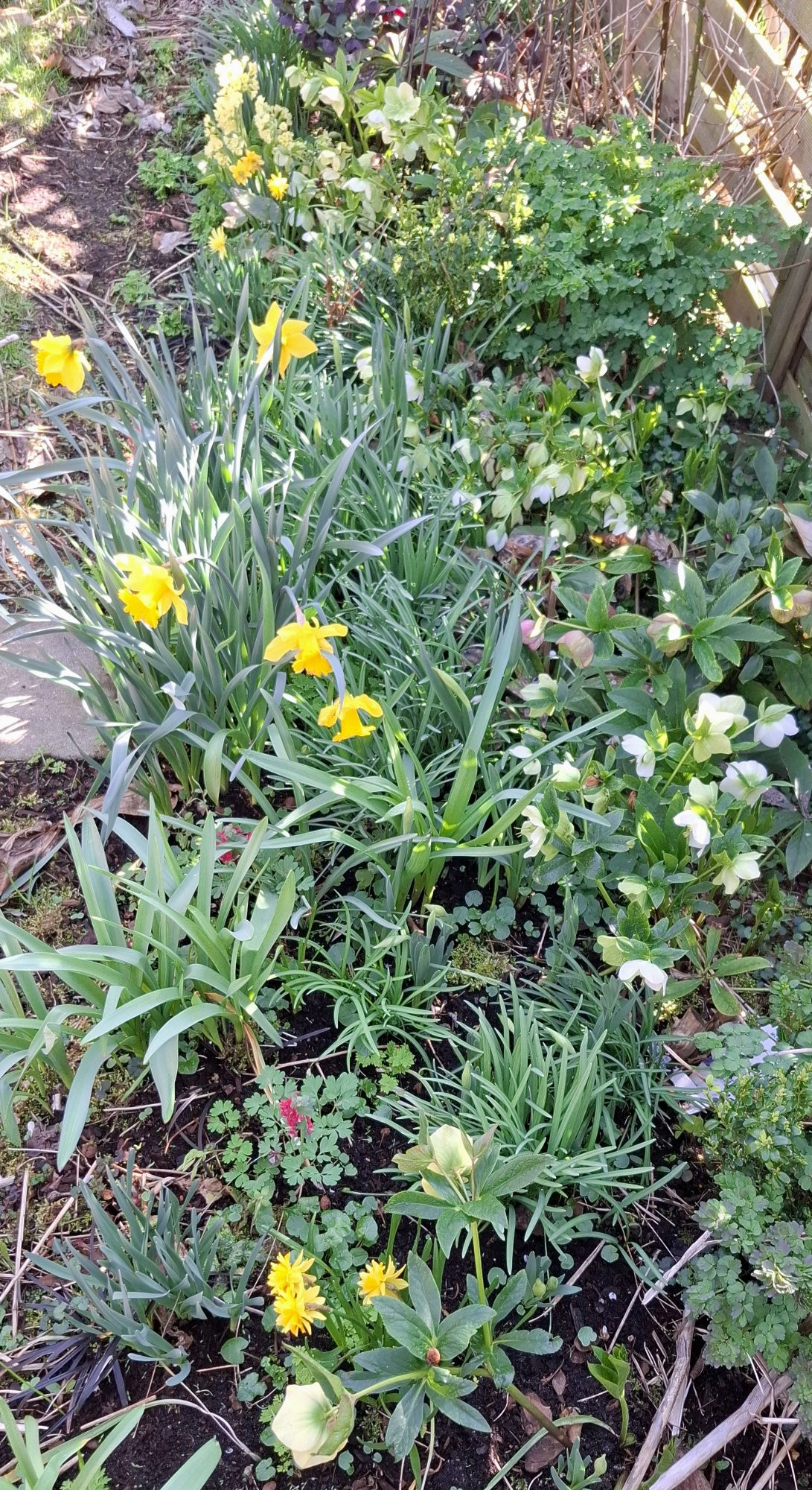 Im Beet gegenüber leuchten immer noch massenweise Narzissen, zu den gelben Osterglocken gesellen sich nun immer mehr weiße Sorten, und die dunkelrote Wolfmilch leuchtet mit einem ganz eigentümlichen Bronzeton im Hintergrund. Ich hatte überlegt, ob ich Cornus 'Anny's Winter Orange' auf den Stock setzen soll (beim 'Midwinter Fire' unten im Garten habe ich's gemacht), aber die Zweige leuchteten noch so wunderbar rot, also warte ich vielleicht noch ein Jahr. Der zartgrüne Austrieb leuchtet ganz wunderbar, ebenso wie die gerade aufblühende Brautspiere, die ich letztes Jahr schon etwas ausgelichtet hatte, hier nach der Blüte aber wohl auch nochmal mit der Schere 'rangehe, da sie aktuell etwas wild in alle Richtungen gewachsen ist.