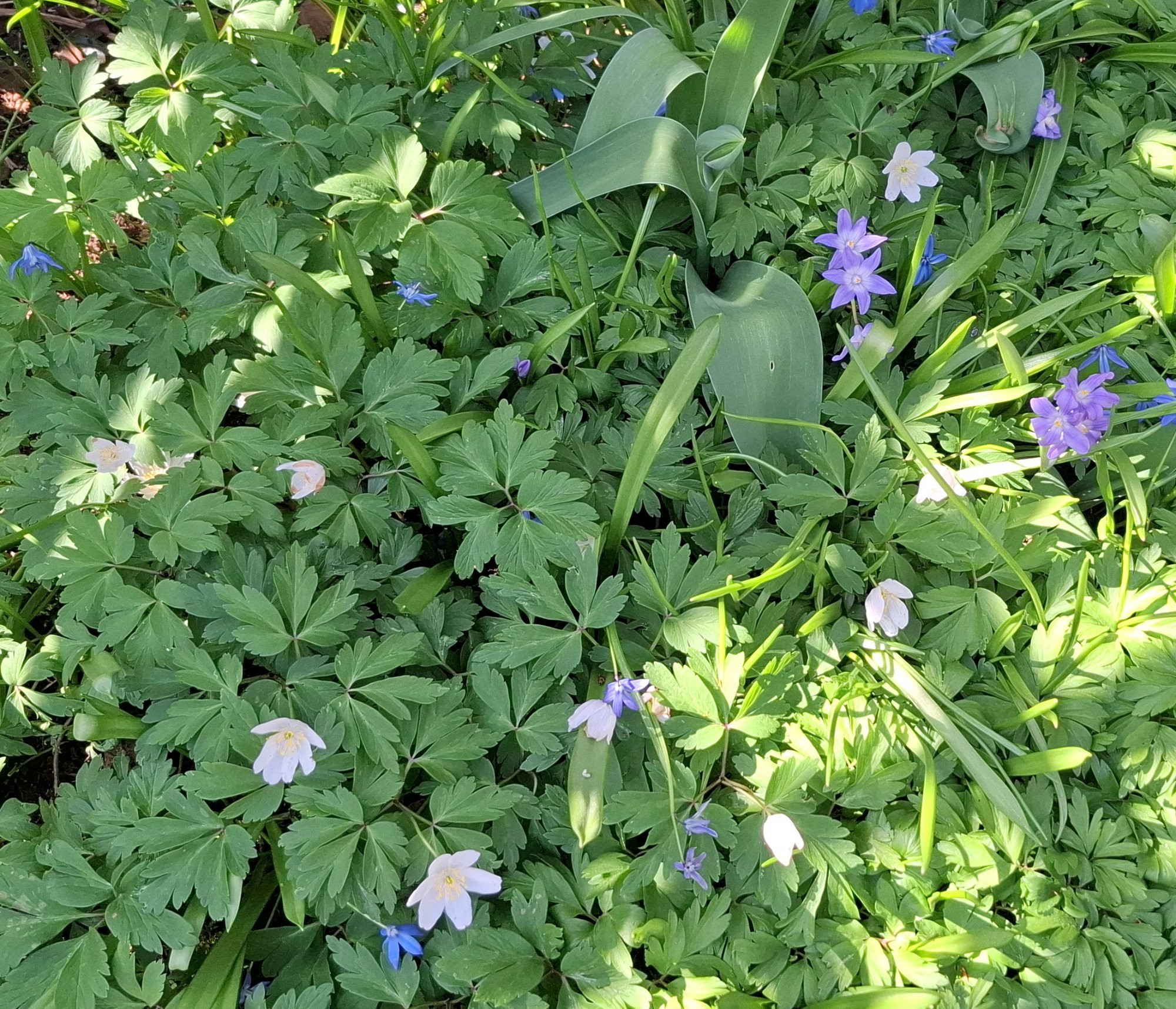 Den letzten Rundgang hatte ich unten im Garten beendet, dort fange ich diesmal an, wieder am frühen Morgen, da ist gerade das Licht der hinterm Berg aufgehenden Sonne, welches zusätzlich noch durch meine große Tanne gefiltert wird, so schön. Unter Hamamelis 'Jelena' blüht immer noch das Lungenkraut sehr üppig, auch unter dem gerade austreibenden Acer palmatum 'Orange Dream' hält sich nun schon seit Jahren ein großer Horst und erfreut insbesondere die Hummeln. Die weißen Blütensterne von Narcissus 'Thalia' leuchten selbst im Schatten, und Primula elatior scheint sich hier ebenfalls wohlzufühlen. Durch das ein wenig arg ausläufernde Perlkörbchen leuchten auch gerade die Blüten des Gundermanns, die finde ich ja sehr reizend, die meterlangen Ranken, die der Gundermann im Sommer dann macht, allerdings nicht so sehr.