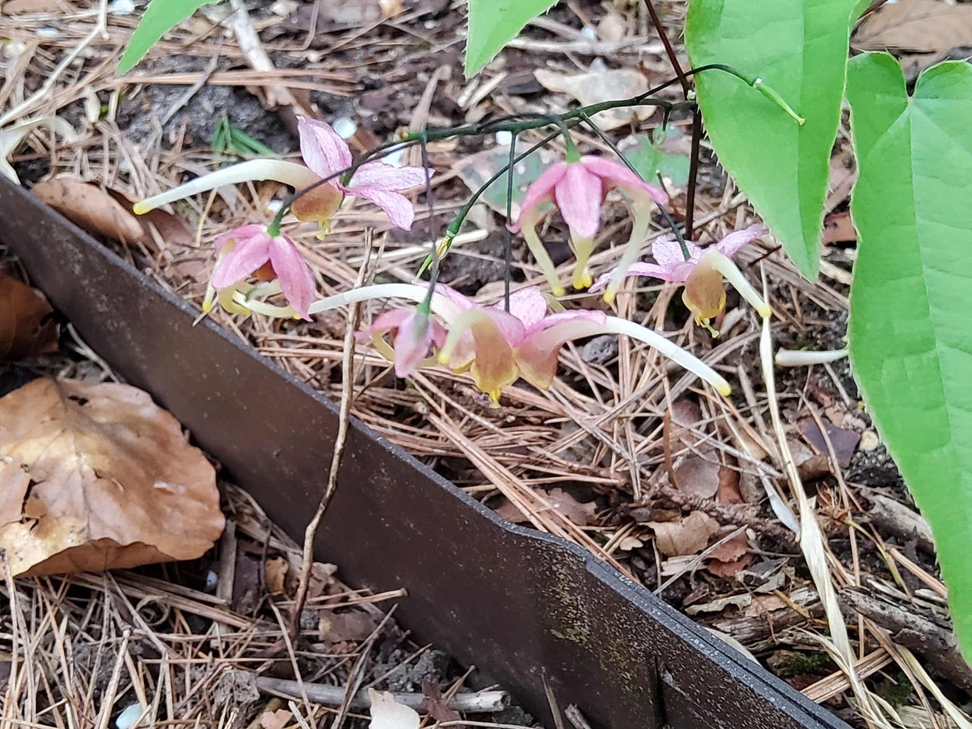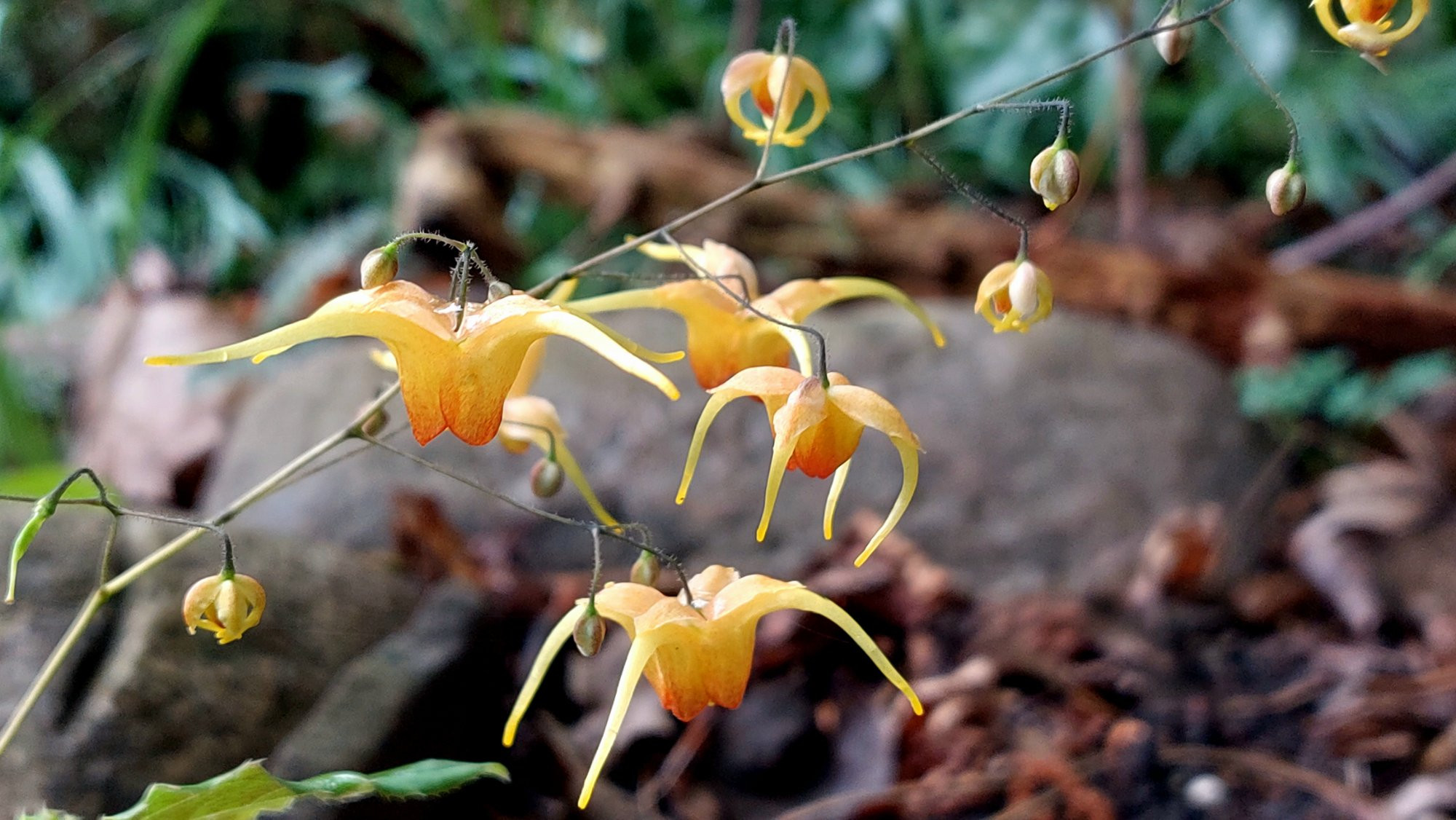 Hier zeigt sich gerade Epimedium Mandarin Star. Die wächst eher locker mit einzelnen, langen Blütenrispen:
