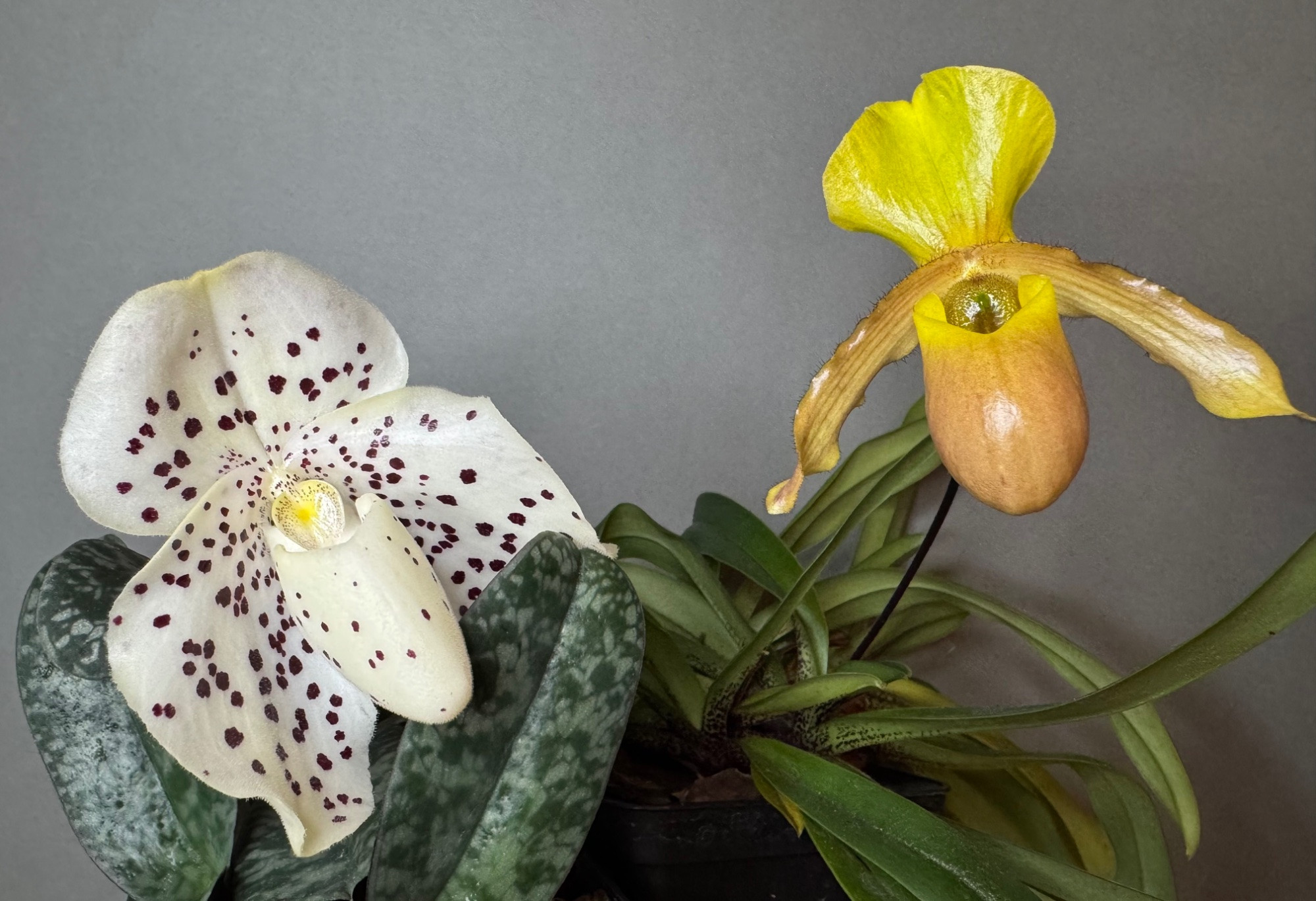 Die gepunktete Schönheit ist Paphiopedilum wenshanense (bin nicht auf dem Laufenden ob das mittlerweile eine eigene Art ist oder die Hybride aus concolor x bellatulum. Nummer zwei ist P. Wössner Mini Gold (primulinum x helenae).