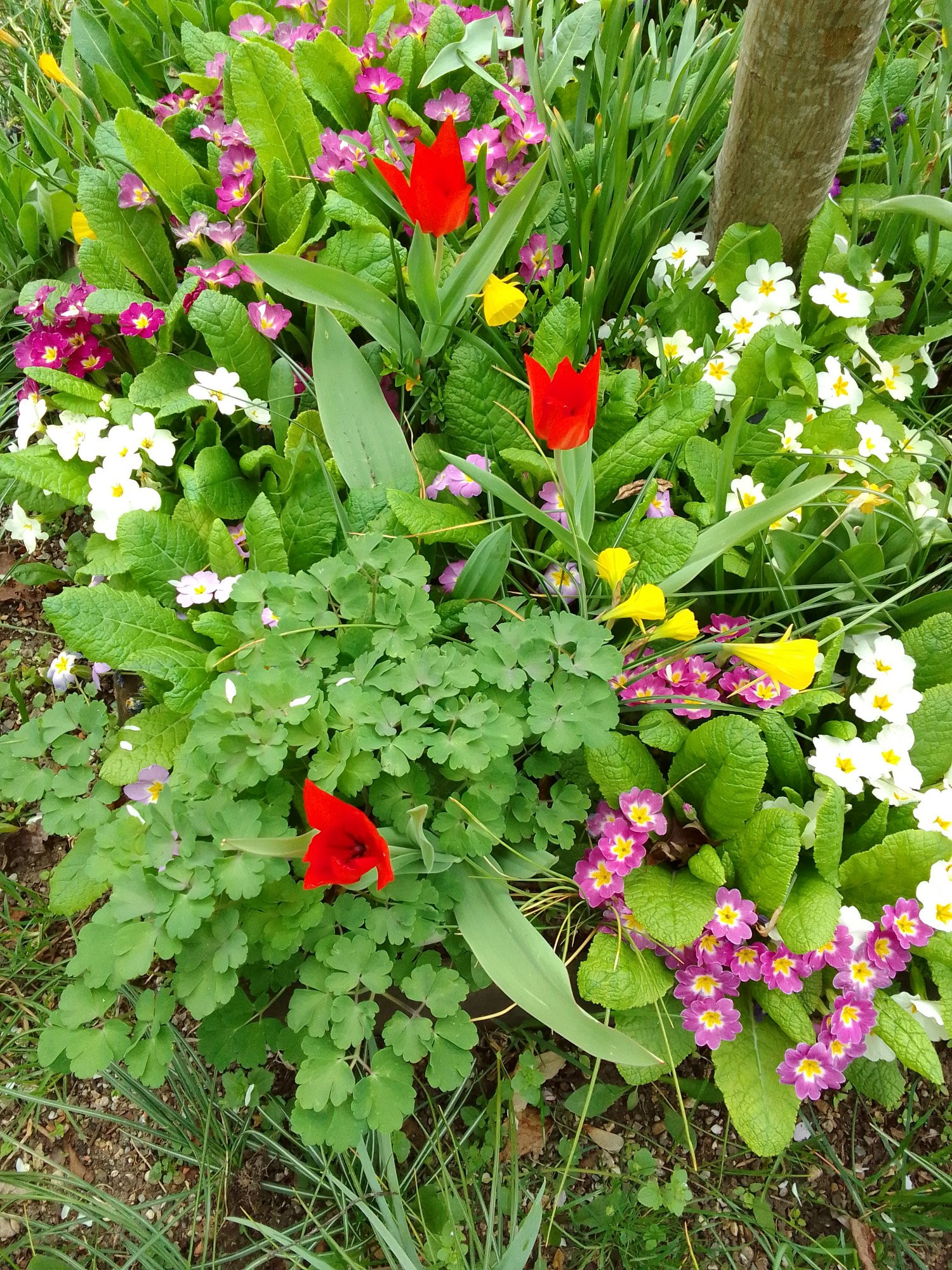 Primeln,Narzissen und Tulpen warten auf den Regen.