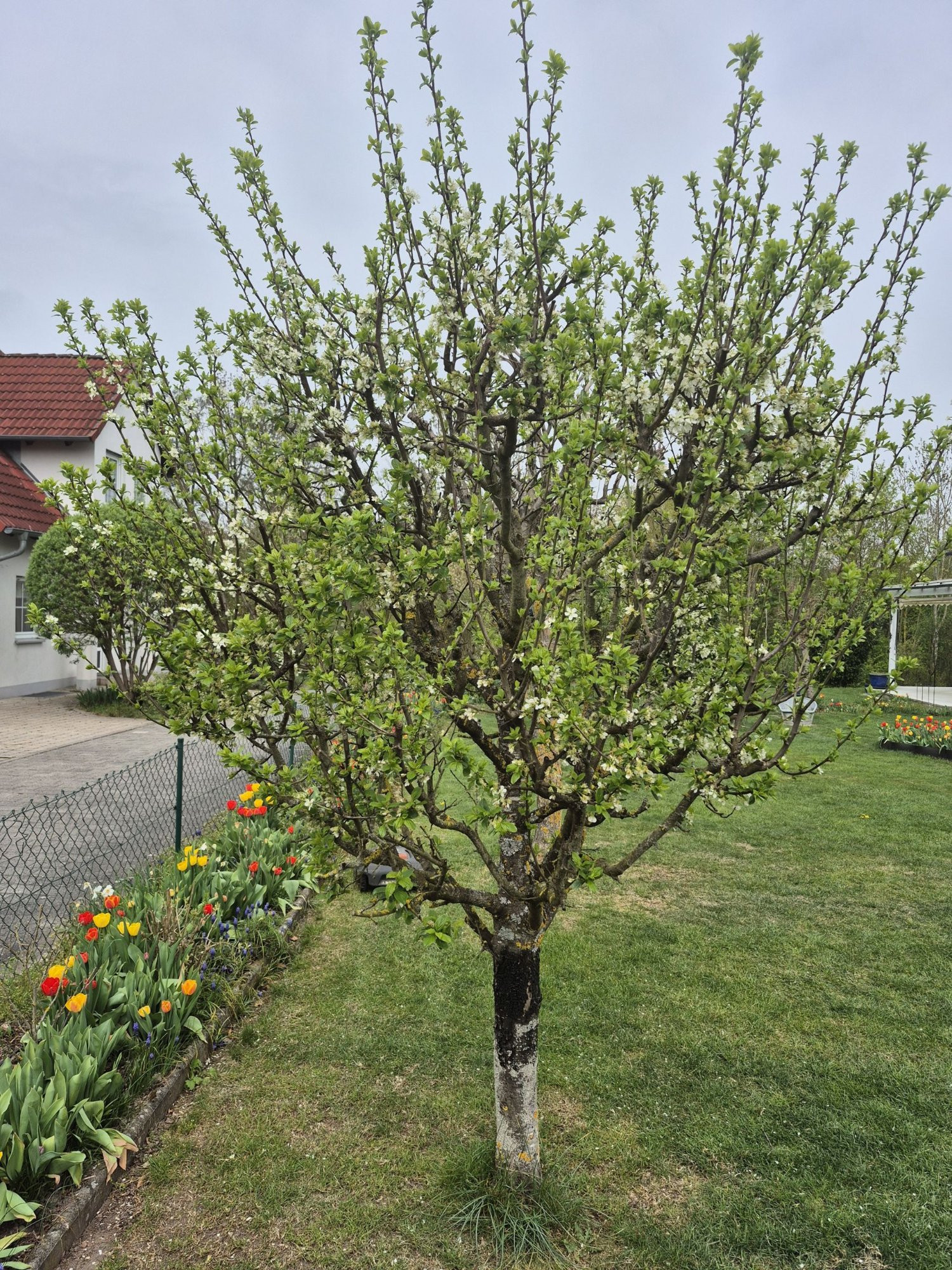 Das schöne ist, auch wenn die Zwetschge eine Hauszwetschge wäre, wäre sie schnittbereit. Hauszwetschgen zicken ein wenig herum beim Schnitt, wenn sie noch nicht in die Blüte gekommen ist. Der erste Blühbeginnt zieht sich dann ins Unendliche.