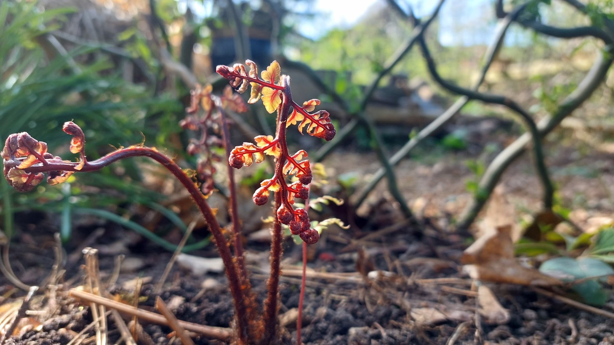 Haben bei Dir alle Farne schon so weit ausgetrieben, dass Du das beurteilen kannst? Hier sind sie größtenteils noch nicht so weit. Beim Green Lace habe ich gerade nachgeschaut, er ist weiter als z.B. der benachbarte Bevis. Ich habe 15 Farnrollen gezählt, bei ihm war ich etwas besorgt, weil ich kürzlich nachgeschaut hatte und dabei festgestellt habe, dass tief unten im Herz der Pflanze ein kleines grünes Fröschlein sein Winterquartier hatte