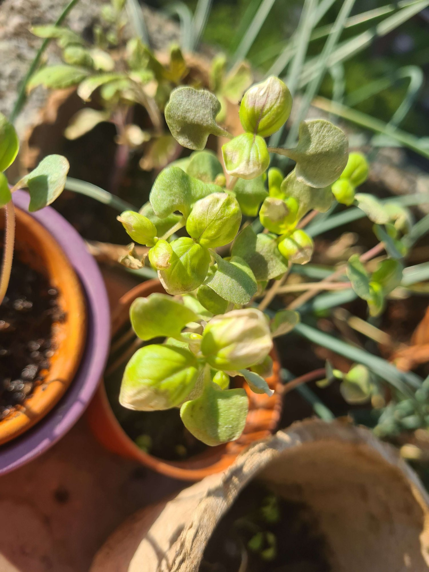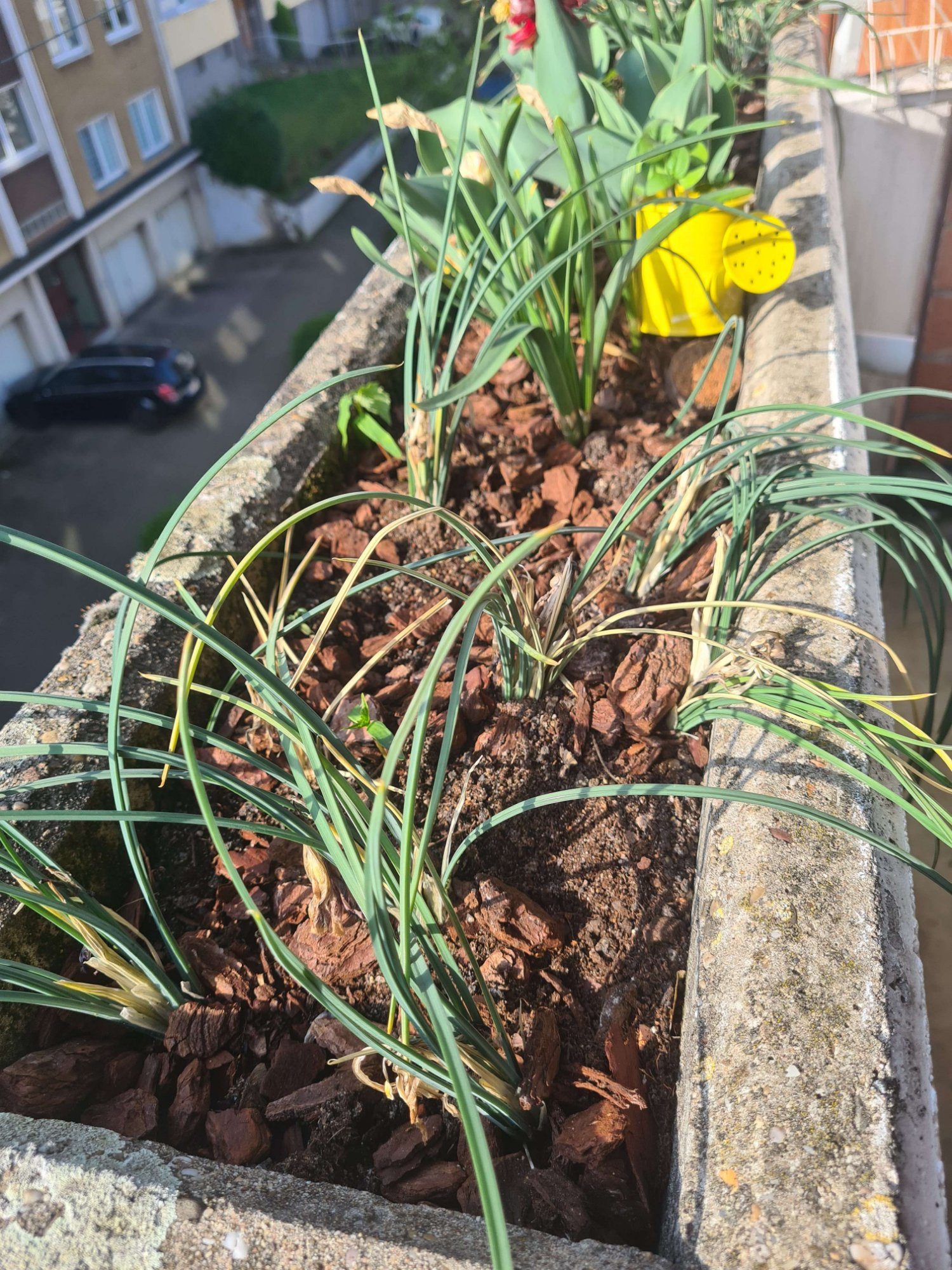 4. Kann ich ein paar der Setzlinge (Basilikum oder diverse Bienenfutterpflanzen) auch zu den Zwiebeln im "Balkonkübel" hinzusetzen, oder sollten lieber alle einen eigenen Topf haben? (Fotos siehe unten)