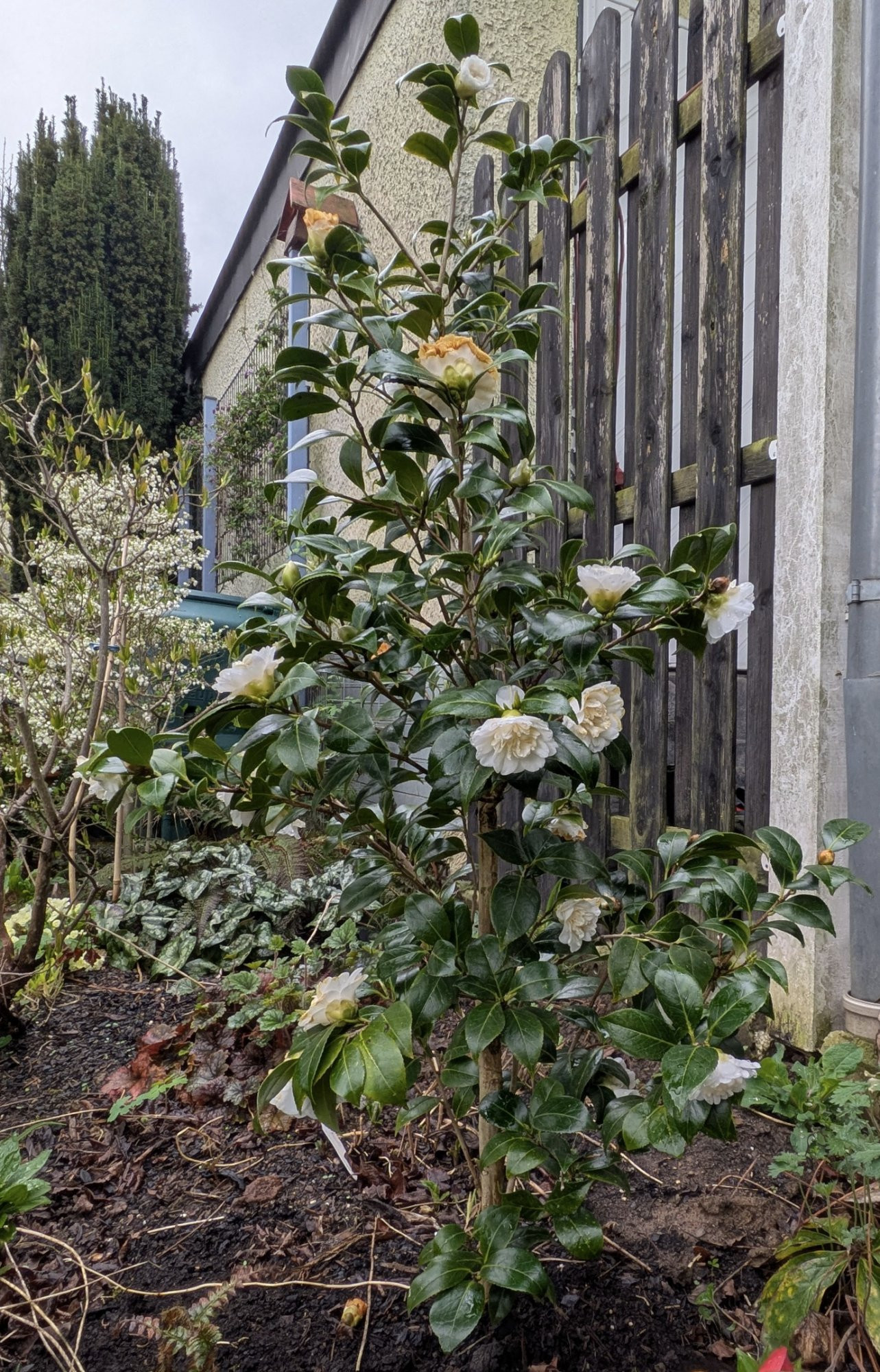 Mit Jules zahlreichen Kostbarkeiten kann und will ich auch gar nicht mit halten. Ich bin schon froh, dass einige Kamelien all die Jahre unser wenig Kamelien-freundliches Klima dennoch akzeptiert haben. Der Knospenansatz war in diesem Jahr leider sehr gering.