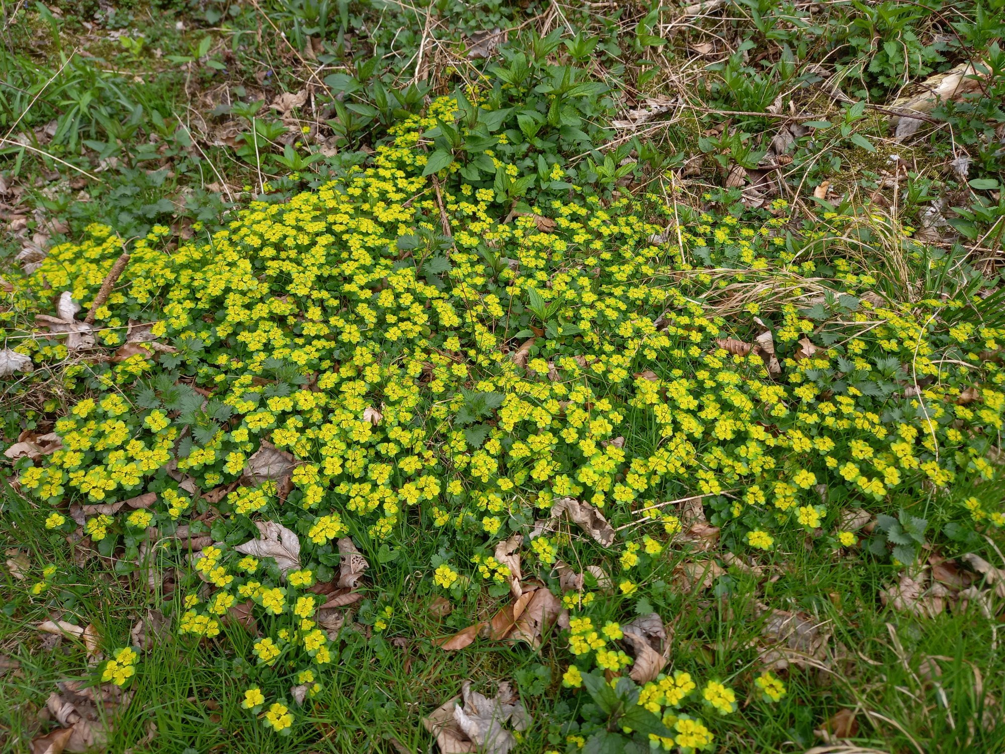 Hier nicht ganz so nass, wegbegleitend ein Milzkraut und Buschwindröschen, Bärlauch und Aronstab einträchtig nebeneinander