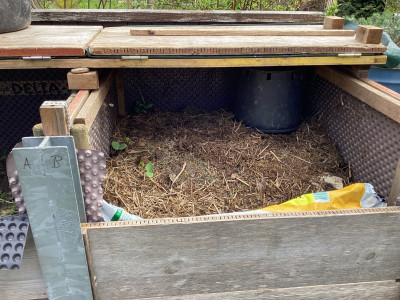 Im Frühjahr 2025 wenig Rasenschnitt gehabt, ergänzt mit oberster Schicht von Box A) = Alltagskompost und schon spriesst es. :D