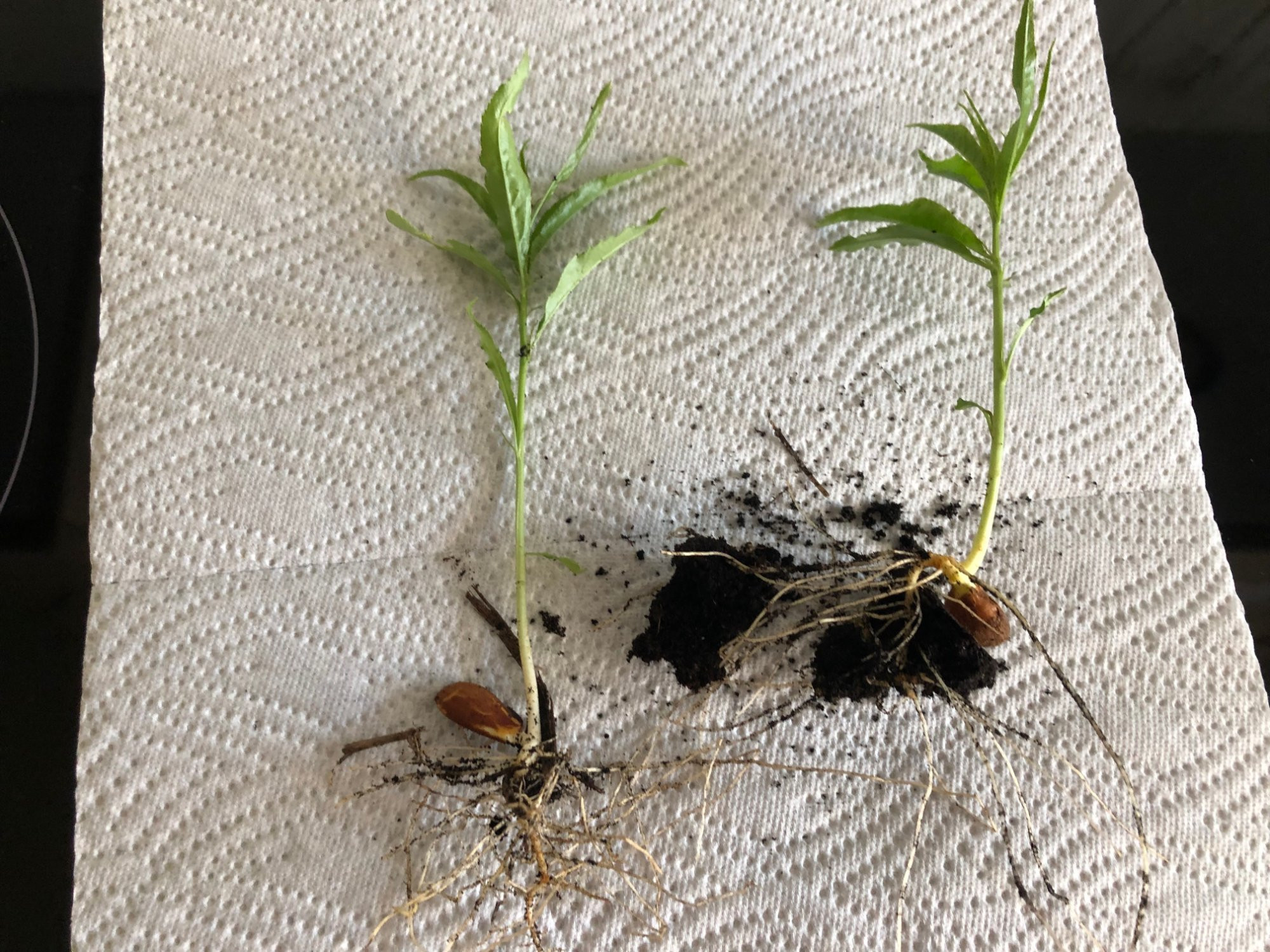 was ein Zufall, dass ich einen Pflanzkübel mit spontanen Pfirsichsämlingen kenne, beim Büro um die Ecke, hatte ausserdem zufällig mein Horimesser dabei (in der Satteltasche, mitm geleerten, gereinigeten Komposteimer), und siehe da, es waren 2 vorjährige und 2 ganz frische. Die größeren waren schon arg im Trockenheitsstress.