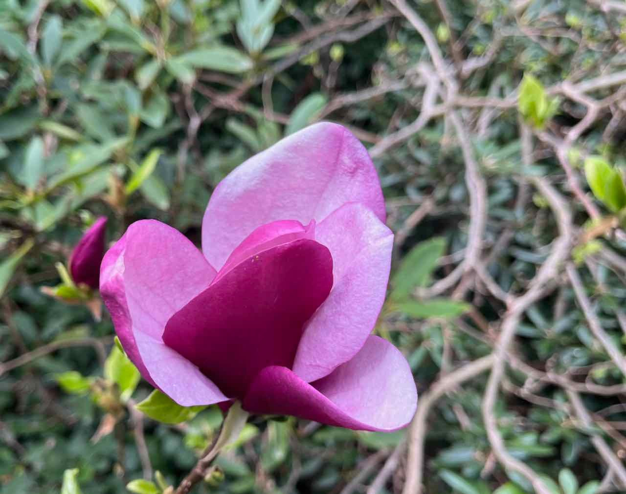 Meine späteste Magnolie, sonst erst in drei Wochen blühend, aber teils schon mit Laubaustrieb: die namenlose "Nakamura 3". Die Blüten sind noch nicht ganz geöffnet.