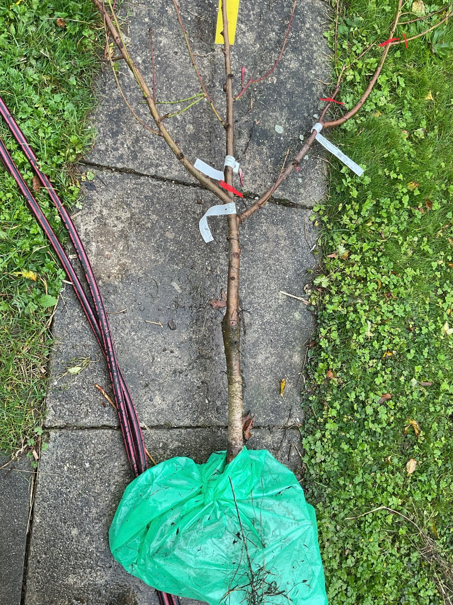 Konnte überraschend schon diese Woche abholen, ziemlich groß, und wie ein hilfreicher Baumschuler noch bemerkte, eher 2 Saison gewachsen, hmm