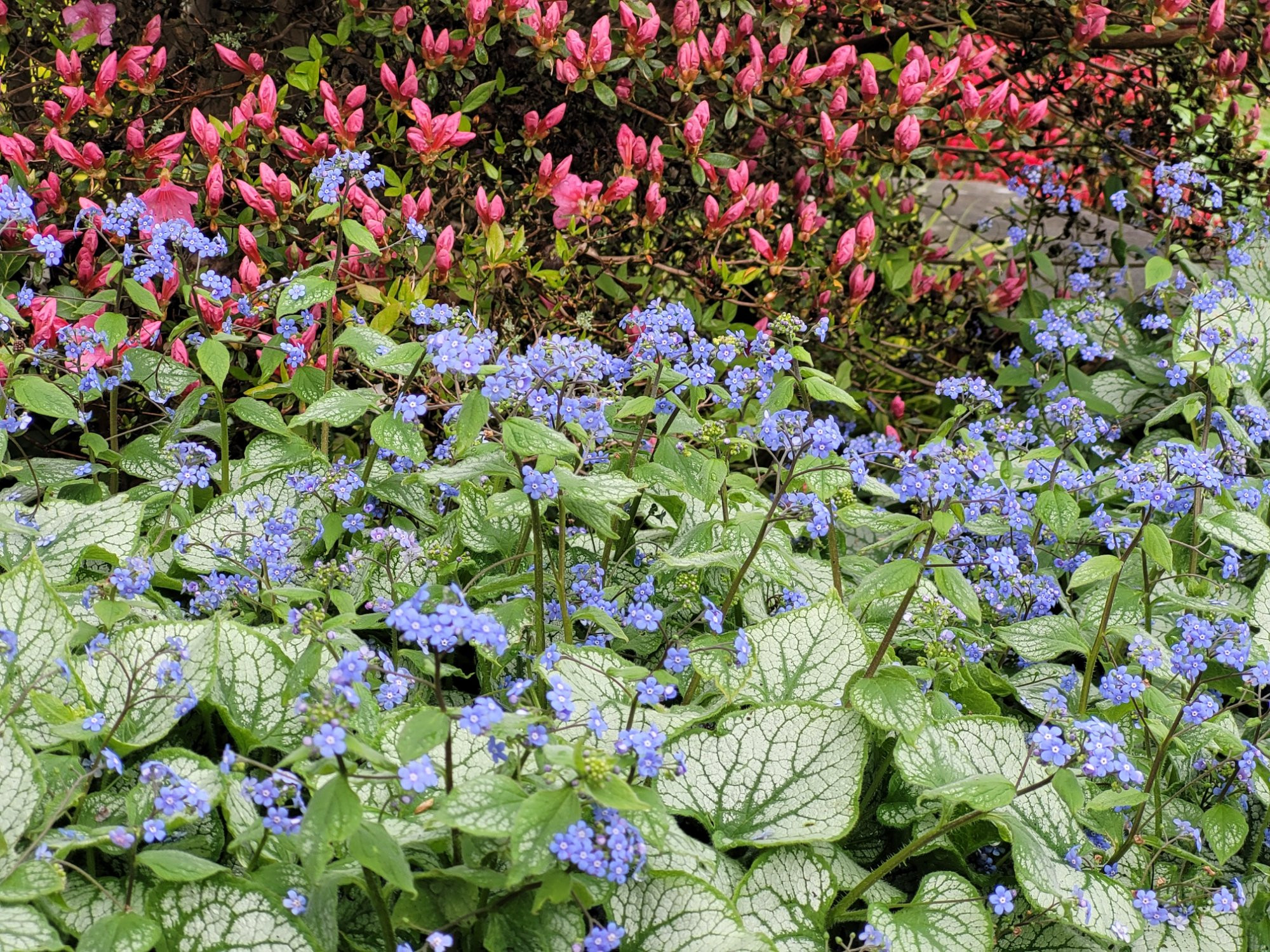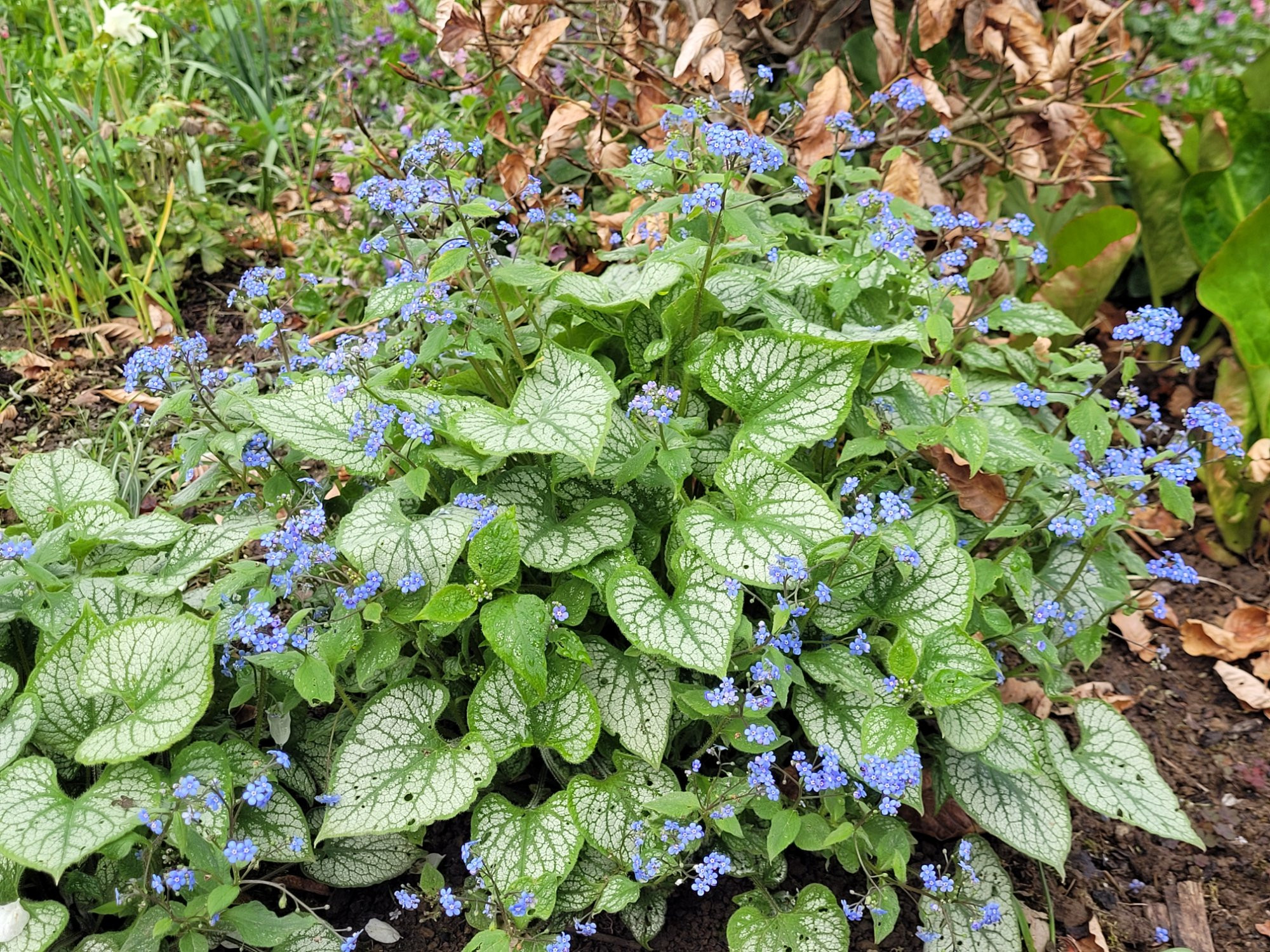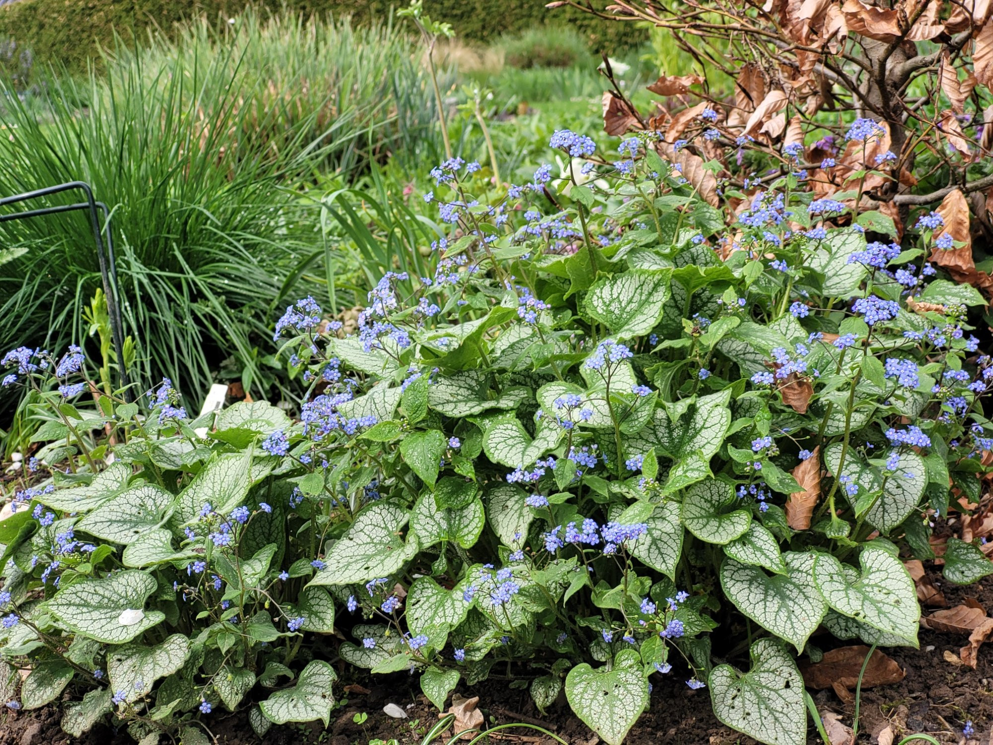 Besonders üppig blüht hier zurzeit Brunnera 'Jack Frost' an verschiedenen Stellen.