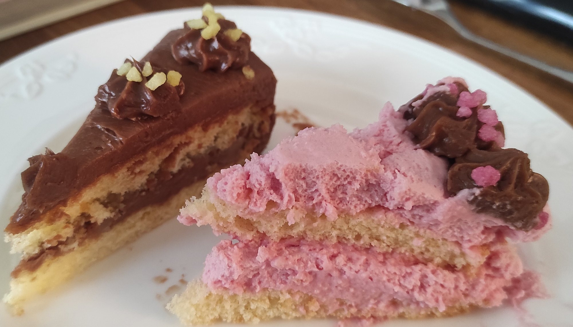 Heute morgen bekam ich ein Video in dem der Hausherr das Messer in der Torte versenkt und das erste Stück schneidet.